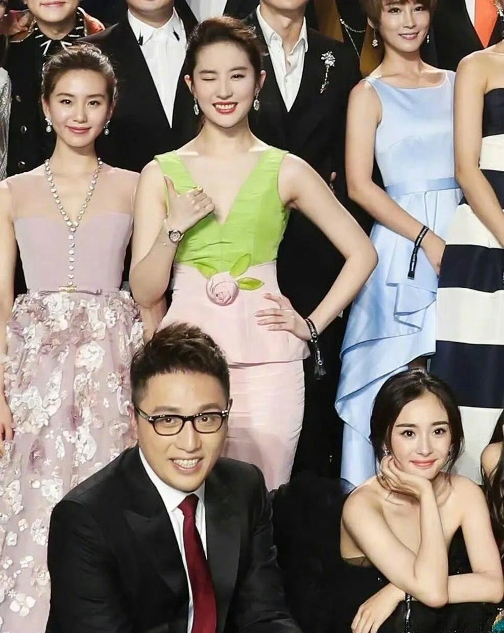 Vogue大合照环节来了,刘冲把C位留给了自己双C位:左杨幂,右刘亦