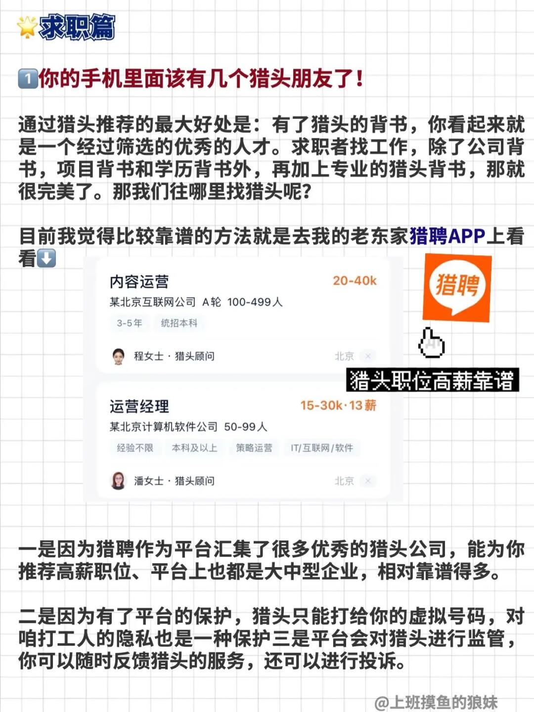 一个好猎头就是你生命中的贵人,猎头不找你,你就去猎聘上找猎头!大中型企业一般都是用猎头找人的。