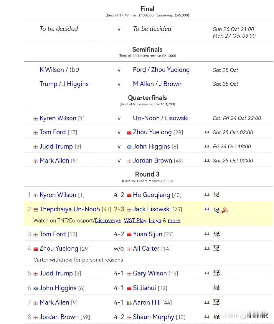 北爱尔兰公开赛8强出炉,周跃龙成为中国军团独苗。贺国强2-4负于凯伦·威尔逊。东道主选手乔丹·布朗4-2爆冷击败墨菲。晋级8强的其他5人是:福德、特鲁姆普、艾伦、希金斯、小司机。1/4决赛周跃龙对福德。 贺国强实力与凯伦·威尔逊有不小差距,1-3落后,追了一局,第6局,威尔逊两次上手,总比分4-2锁定胜局。 昨晚,斯佳辉1-4负于希金斯,感觉两人不是一个级别。稍早前,袁思俊状态不佳,2-4负于实力不是太强的汤姆·福德。 至此,周跃龙因卡特退赛,成为本次8强中中国斯诺克军团的独苗。 凌晨进行的一场比赛,东道主选手乔丹·布朗4-2爆冷击败强大的墨菲,晋级8强。布朗3-0领先,被墨菲连追两局。第6局,墨菲比较悲催,已经超分,被布朗做了多杆斯诺克逆转。 布朗本次比赛表现出色,第一轮4-0零封赵心童,第二轮又以4-0零封休吉尔,本轮战胜强大的墨菲,有点黑马的感觉。1/4决赛他将迎战同为本土选手的艾伦,这回晋级难度很大。 其他比赛结果是: 艾伦4-1胜亚伦·希尔、特鲁姆普4-1胜加里·威尔逊。 今天凌晨最后一场比赛刚刚结束,进攻型选手塔猜亚与小司机对决,最终小司机4-2获胜,搭上8强末班车。 今天1/4决赛开打,周跃龙签位不错,对阵福德,希望能更进一步。1/4决赛详细对阵如下: 19点: 特鲁姆普vs希金斯 22点左右(接台): 凯伦·威尔逊vs小司机 明天凌晨2点: 周跃龙vs福德 乔丹·布朗vs马克·艾伦。 1/4决赛采用9局5胜,周跃龙,加油!