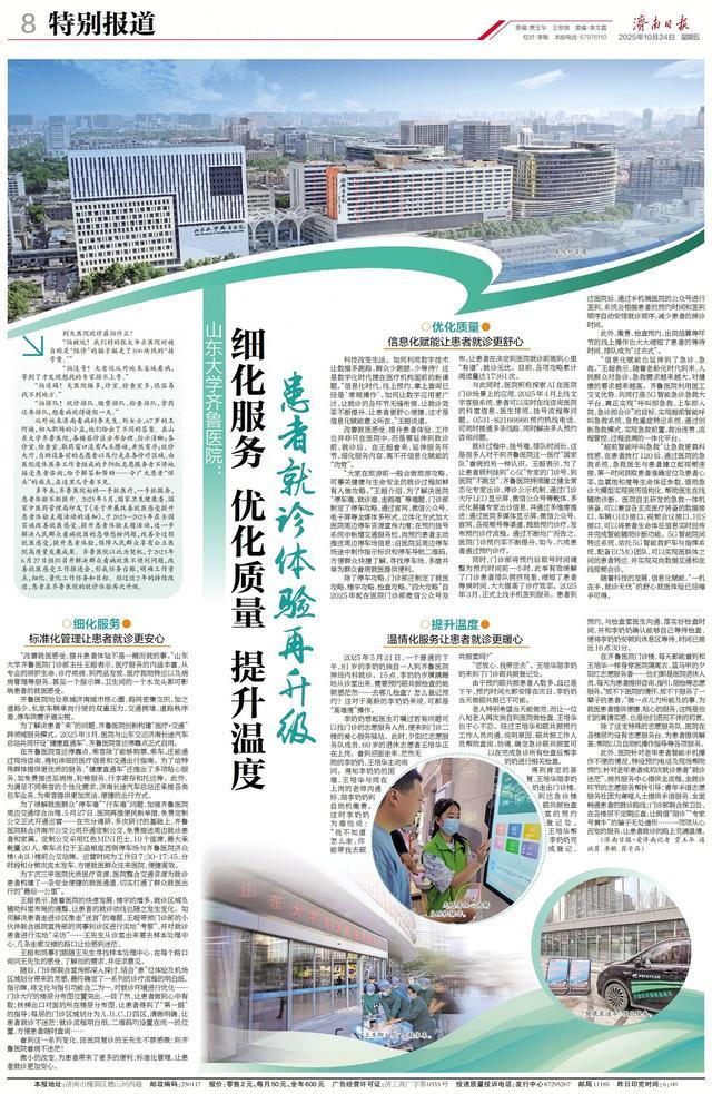 从外地来济南看病的李先生、刘女士,67岁的王阿姨,初入职场的小孟,他们给出了不同的答案。在山东大学齐鲁医院,各楼层诊区分布合理、指示清晰;各诊室、检查室、取药窗口没有人头攒动,井然有序;就诊大厅、自助设备前的志愿者以及行走在各诊疗区域、由医院退休医务工作者组成的夕阳红志愿服务者不停地接受患者咨询,给予解答和帮助……令广大患者“怵头”的痛点,在这里几乎看不见。