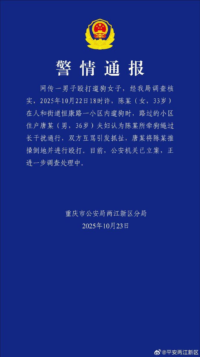 重庆一女子牵绳遛狗时被男子殴打,警方通报:已立案