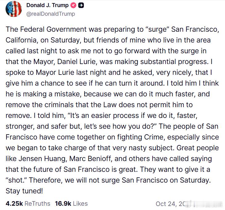 联邦政府原本计划在周六对加利福尼亚州旧金山进行“增援”,但我住在当地的朋友昨晚打电话来,请我不要继续增援,因为市长丹尼尔·卢里正在取得实质性进展。我昨晚与卢里市长通了电话,他非常礼貌地请求我给他一个机会,看他是否能扭转局面。我告诉他,我认为他在犯一个错误,因为我们可以做得更快,清除法律不允许他清除的犯罪分子。我对他说:“如果由我们来做,会更容易、更快、更强、更安全,但——让我们看看你能做成什么?”