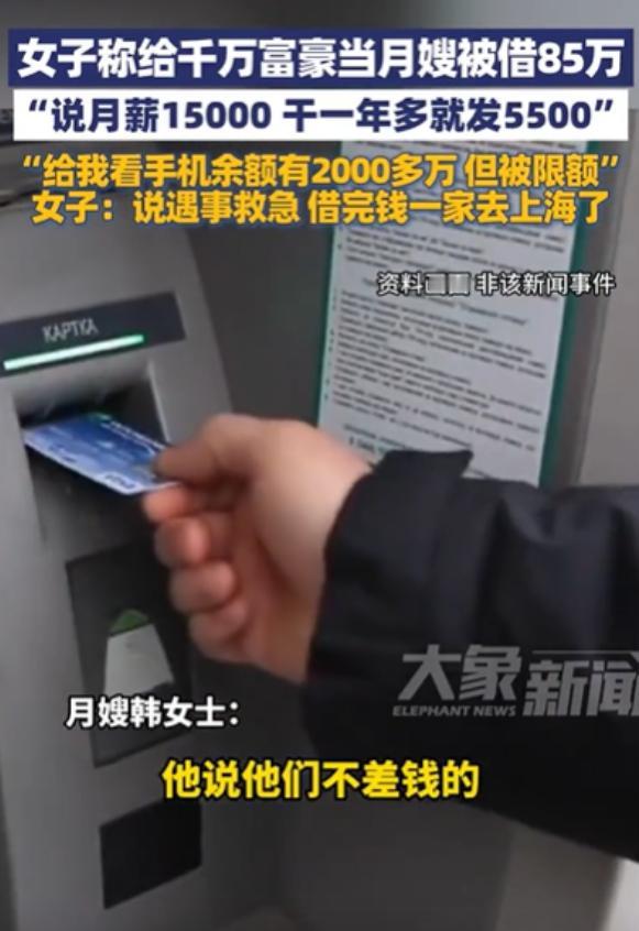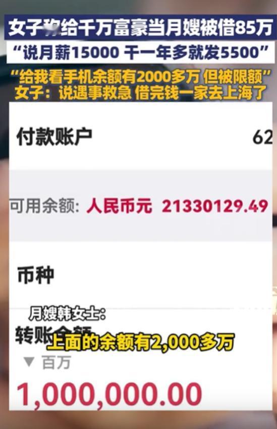 浙江湖州,女子给千万富豪当月嫂,月薪15000元,她还以为遇到了大雇主,结果,她干了1年多,却只收到5500元工资,不仅工资没收到,还反被雇主借走85万,雇主一个劲解释:卡上有2000多万被限额!取不出来,让女子帮帮忙!不料,借完钱后雇主一家就跑上海去了!   河南郑州的韩女士干月嫂多年,去年总算盼来个“好活儿”——浙江湖州一户人家请她住家带娃,月薪开15000元,比平时行情高出一截。   雇主说自己是千万富豪,韩女士想着碰到大方主家,收拾行李就上了门。   报到当天,雇主塞来5500元红包,说算提前给的零花钱,住的房子看着阔气,雇主说话也敞亮,韩女士心里踏实,干活格外尽心。   可到了该发工资的6月,宝宝奶奶突然哭丧着脸找过来,说男朋友在上海被查,得交保证金,宝爸已经赶去处理了。   “我们家不差钱,就是卡被限额,2000多万取不出来,”奶奶边说边翻出手机照片,屏幕上银行卡余额明晃晃写着213万多。   宝爸后来也补了句,等事情了结,工资连利息一起给,韩女士瞅着余额截图,又想起进门时的红包,心一软就信了。   这一信,就掉进了连环套,往后一年多,工资从没兑现,雇主反倒隔三差五借钱,一会儿说保证金不够,一会儿说寄售的路虎要交过户费,不然赔两万违约金,每次都拍胸脯说“车卖160万,到账先还你”。   韩女士积蓄很快掏空,雇主又教她找亲戚借,变卖首饰,最后干脆指导她弄网贷。   中间韩女士催过钱,雇主发来50万转账截图,说钱已打过去,她守着银行卡刷了一天,一分钱没见着,问起来对方只说系统延迟。   就这样,一次次心软,一次次被“千万身家”的幌子迷惑,她前前后后拿出85万。   等韩女士实在借不到钱,雇主态度立马冷下来,某天她下班回家,发现雇主家东西全搬空了,问起来才知道一家人跑去上海了,接下来四个月,电话不接消息不回,韩女士这才慌了,赶紧报警。   警方介入后,雇主只还了1万,写了张84万的欠条,嘴里还硬气,说“家里房子存款都有,家底肯定2000万,没骗你”。   可韩女士去小区物业一问,心彻底凉透,那套“豪宅”根本不是雇主的,是租来的。   现在韩女士日子过成一团糟,网贷催款电话天天打,亲戚朋友追着要钱,她只能一遍遍解释自己被骗了,当初那15000元的高薪没见着,一年多辛苦只换來5500元,反倒背上一身债。   这事儿看着气人,其实全是骗子的老套路:先拿高薪豪宅包装富豪人设,给点小甜头拉近距离,再用“卡限额”这类急事儿博同情,最后诱导受害者借钱甚至网贷,专挑月嫂这类心软、实在的从业者下手,太缺德。   目前案子还在调查,那张欠条能不能兑现没人敢说,但这事儿也算给所有人提个醒。   再大方的雇主,涉及借钱都得绷紧弦,所谓的余额截图、豪宅排场,说不定全是假的,善良得带点锋芒,才不会被人当软柿子捏。   那么你对这个事情有什么看法呢?欢迎在评论区留言。