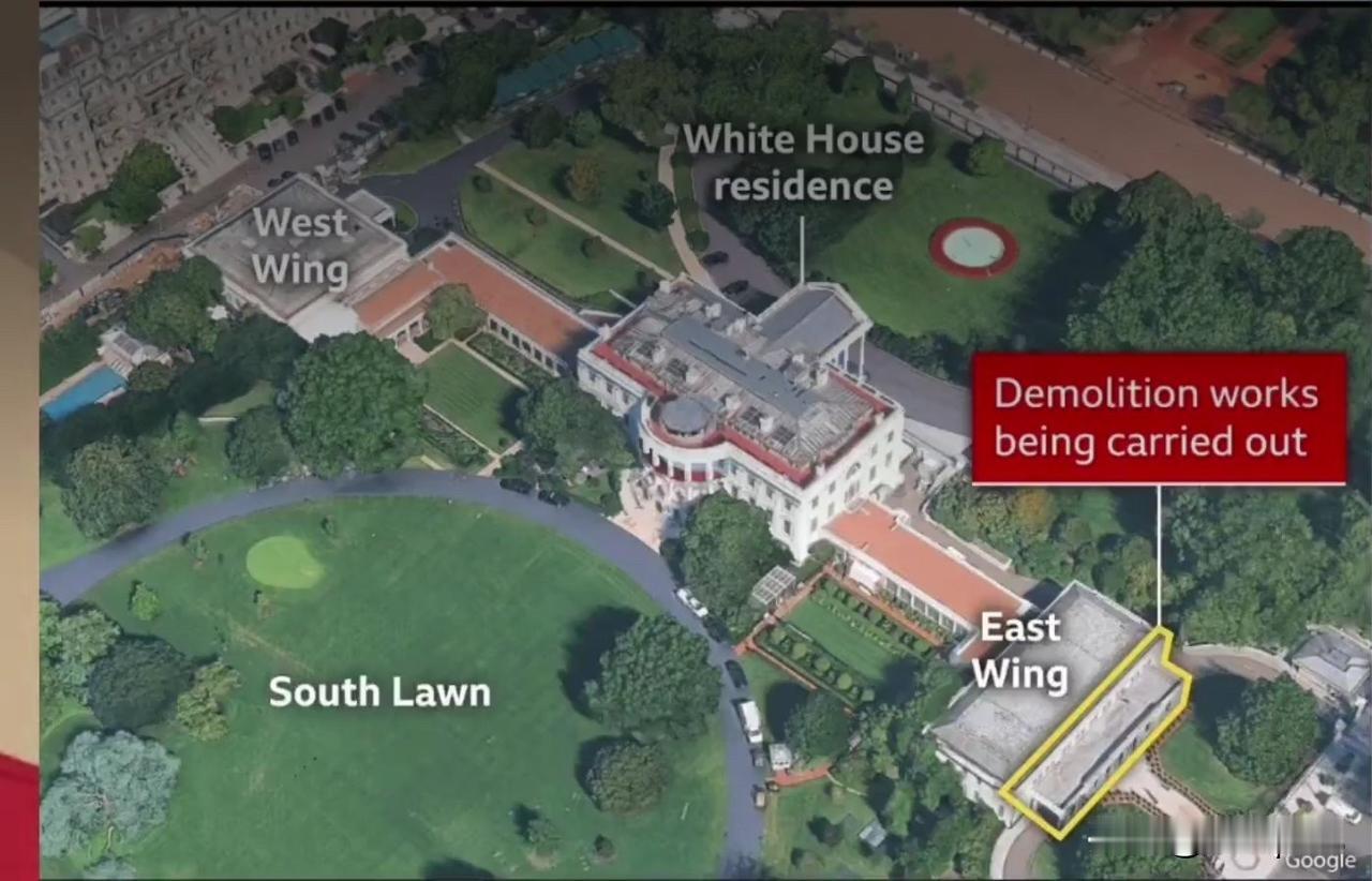特朗普拆掉了白宫东翼。白宫使了一个计谋,刚开始只是说拆掉白宫东翼的外墙,也就是东侧入口门厅。但实际上,他们让施工队迅速拆完了整个东翼,美国媒体与美国人甚至都没有反应过来,有着100多年历史的白宫东翼就消失了。 刚开始,西方媒体只是说白宫东翼的外墙要拆了,BBC还画出图片,标记了要拆除的地方,看起来就是东翼外面的门厅,窄窄的一块。人们猜测,可能特朗普的宴会厅是在原建筑基础上扩建。 但是很快,整个白宫东翼和走廊都被拆掉了。这时候很多美国人才反应过来,特朗普这个工程的规模有多大。看到白宫被拆掉,很多美国人都有了心理创伤,毕竟白宫这个造型建筑已经在人们记忆里根深蒂固了。