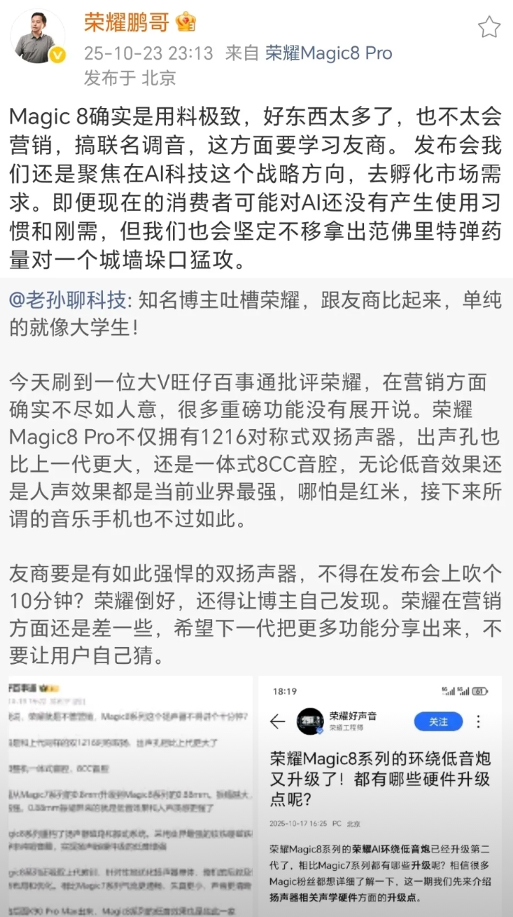 前两天,发了一条吐槽内容,我觉得荣耀在营销方面太单纯了。荣耀Magic8 Pro立体声双扬声器明明是业界顶级水准,发布会上却不怎么介绍,营销跟不上硬件的实力。没想到吐槽被荣耀中国区电商部部长看见并转发了,承认荣耀不会营销,不会搞联名,目前还是聚焦在AI领域给消费者带来更好体验,荣耀真是太低调了。