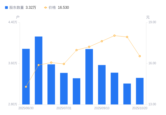 日期A股户数(户)流通A股户均持股数(股)户均持股市值(万元)2025-10-203317936945.9761.072025-10-103206938224.7768.542025-09-303419635847.1864.632025-09-103568334843.8161.392025-08-203879832046.2855.152025-08-083310737554.9563.732025-07-313415336404.7658.102025-07-183581234718.3055.762025-07-104124130147.9547.872025-06-303883932012.4545.75