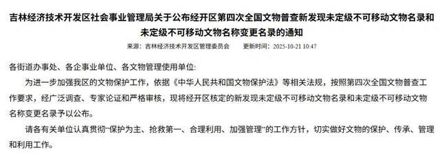 近日,吉林经济技术开发区管理委员会网站发布《吉林经开区第四次全国文物普查新发现未定级不可移动文物名录》。其中,吉林农业科