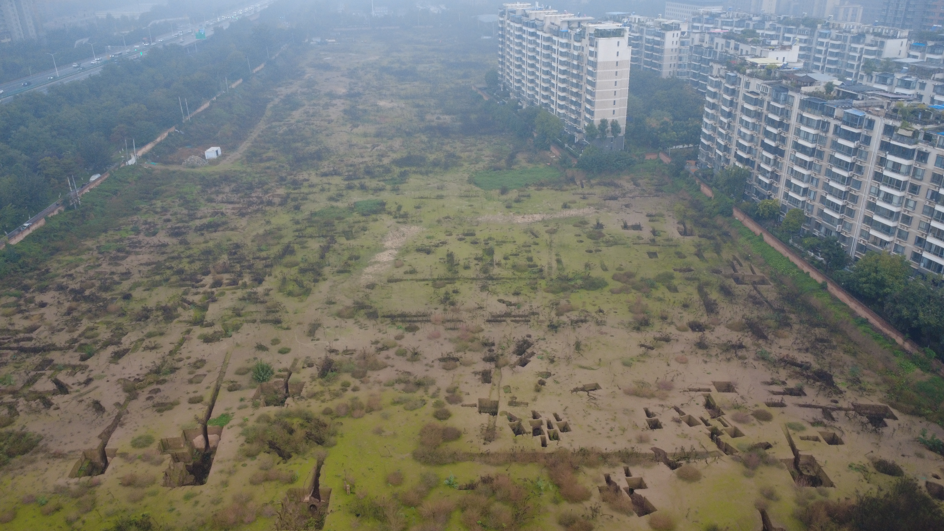 经红星新闻记者核实,“卡卡”所说的考古墓群位于西安市南三环与东仪路交叉口附近,现场大门紧闭已无人在此工作。通过航拍画面可以清晰看到,整个区域内的地面几乎长满青苔和稻草,一些考古遗留下来的坑洞里也长了各种植物。