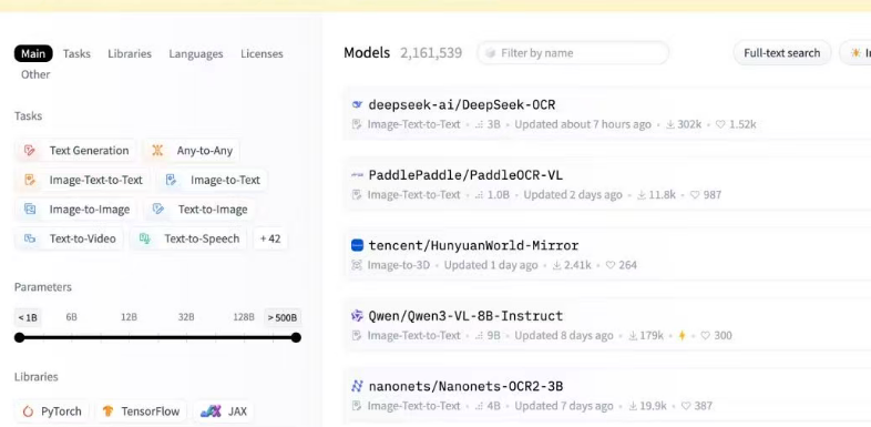 目前,DeepSeekOCR模型热度也带火了多款OCR相关模型,百度PaddleOCR-VL、阿里Qwen3-VL-8B-Instruct、Nanonets-0CR2-3B等在HuggingFace上均排到模型前几名。