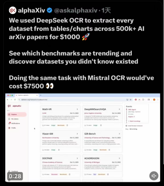 由斯坦福大学学生开发的学术论文在线交流平台AlphaXiv宣布用DeepSeekOCR从自己论文库中的50W+篇AI相关的文章中的表格与图表中,提取了每一个数据集,来看哪个benchmark最流行,并发布成一个新的数据集。这个操作总共花费了1000美元;同样的项目用MistralOCR要7500美元。
