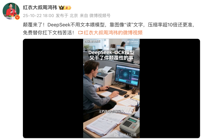 360创始人周鸿祎直接指出,以前的OCR是逐个认字符,不管文字多长都要一个个token堆。但DeepSeek-OCR是把文字当图片压缩,就像把一千字的文档转成JPG,体积小了但内容没丢。这招直接解决了OCR的两大痛点,精度不够和成本太高。