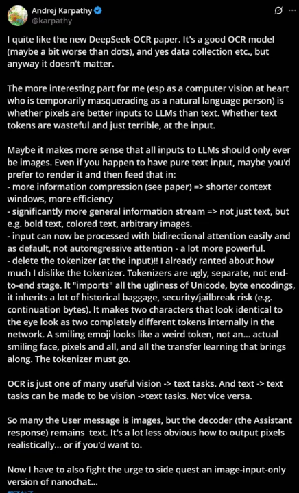 特斯拉前自动驾驶负责人、OpenAI联合创始人安德烈•卡帕西(AndrejKarpathy)在X发长文盛赞DeepSeek-OCR模型,认为像素可能比文本更适合作为LLM的输入。他提出,即便纯文本也应先渲染成图像再输入,这样信息压缩效率更高,并有望淘汰存在安全和效率问题的分词器(Tokenizer)。