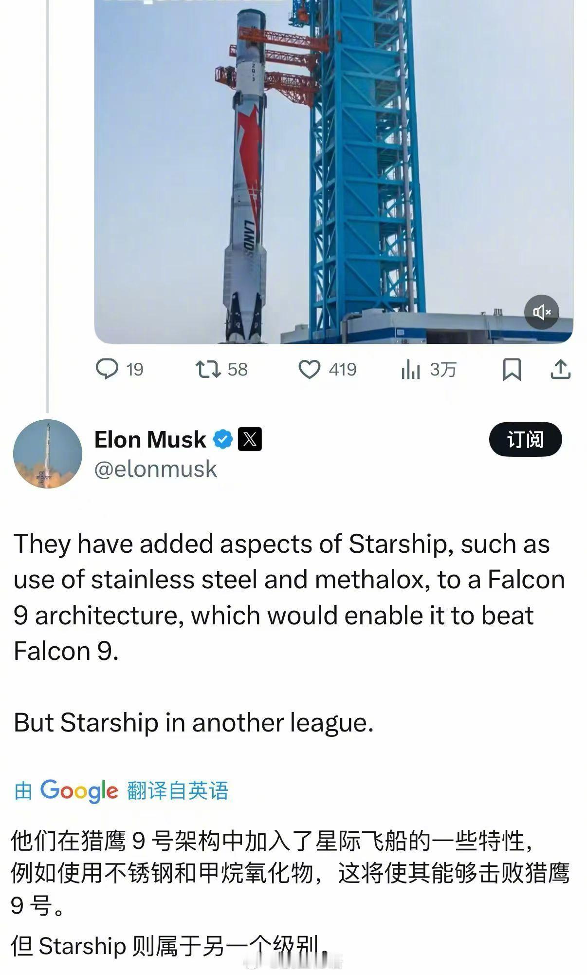 马斯克在“朱雀三号”的视频下方回复称,“朱雀三号”在美国“猎鹰9号”的架构基础上增加了更优秀的不锈钢箭体和液氧甲烷动力,这使得该火箭可以击败“猎鹰9号”,但是马斯克还提到了“星舰”拥有另一个(更优秀)的级别。