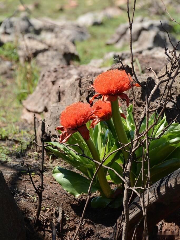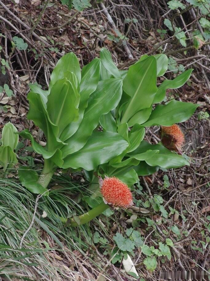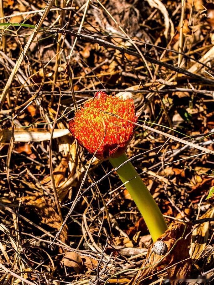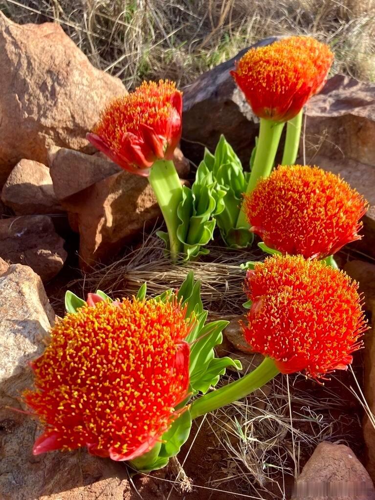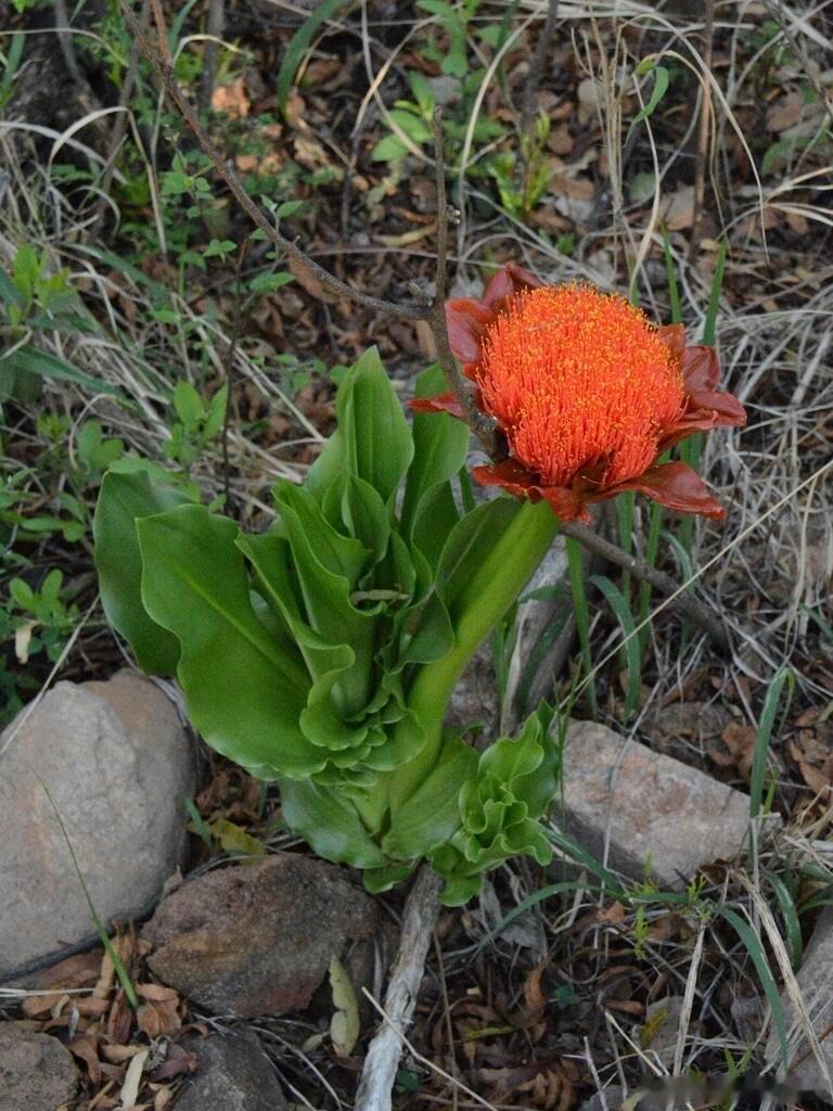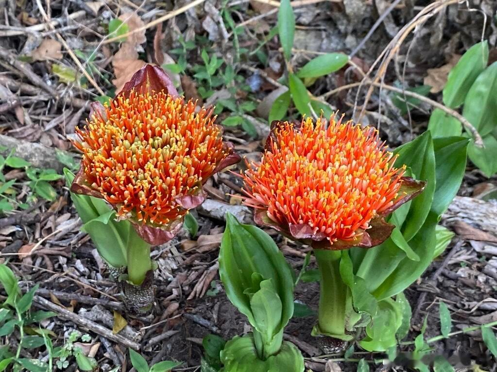 火焰网球花是夏型种,冬季落叶休眠,植株形态多样,花期却超长,从冬末能持续到秋季(南半球7-3月),开花时株高0.3-1.0米。根茎直立,上部膨大呈鳞茎状;叶片2-12枚,宽披针形或卵形,螺旋状排列有光泽,叶缘波状,叶柄状基部形成假茎还带着红褐色斑点。最吸睛的是伞形花序,刷状结构直径5-15厘米,花漏斗状,花被片橙红或红橙色,偶尔还有白色或淡黄色,雄蕊外露直立,花粉鲜黄色,像给花朵撒了把金粉🥰!结的浆果球形,红色或橙色很有光泽,种子球形或卵形呈白色。