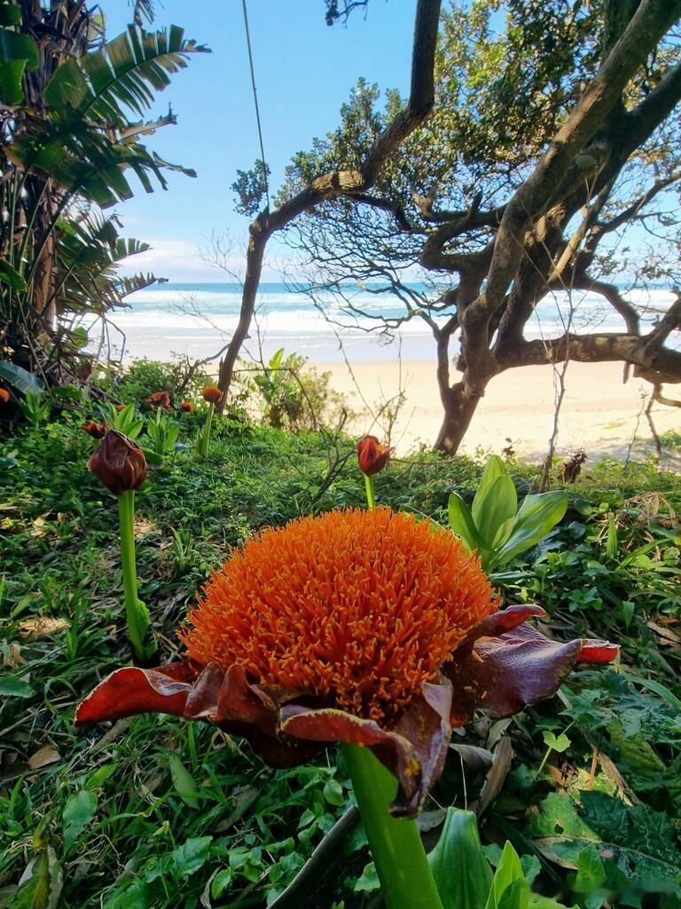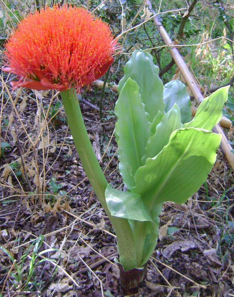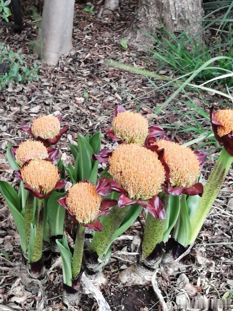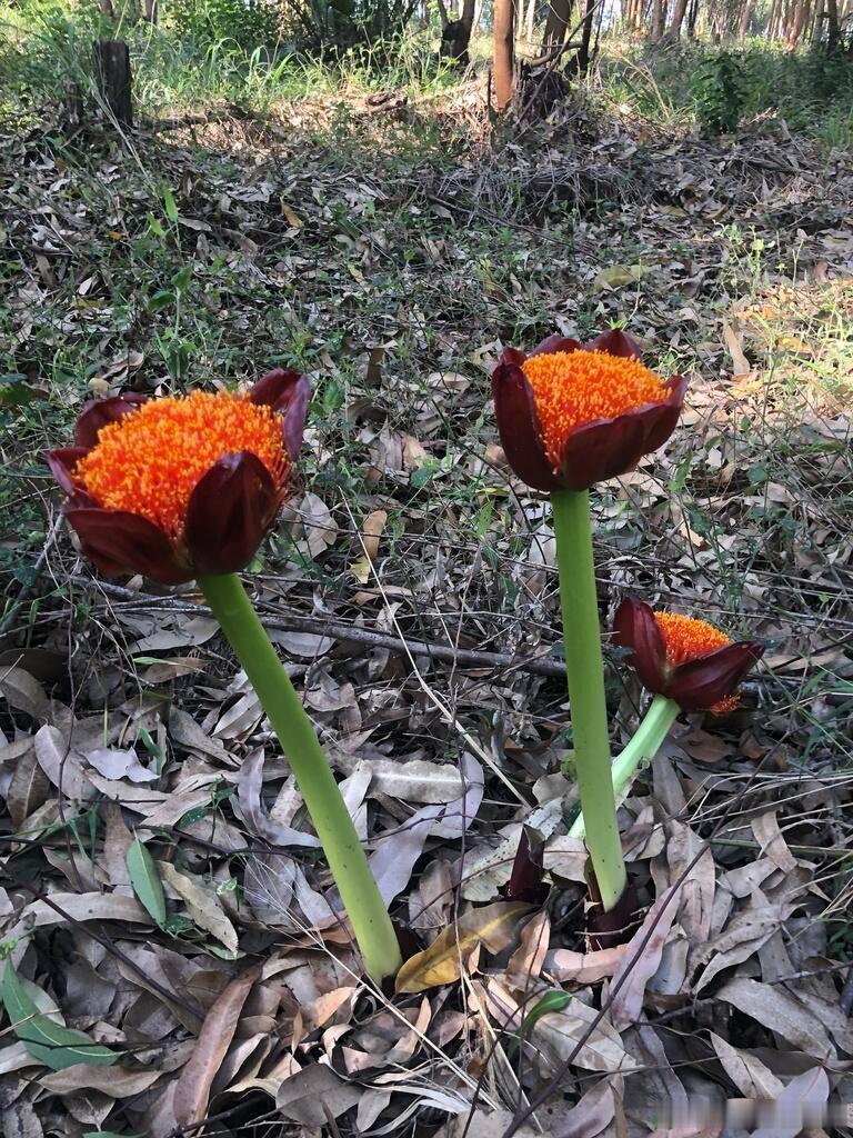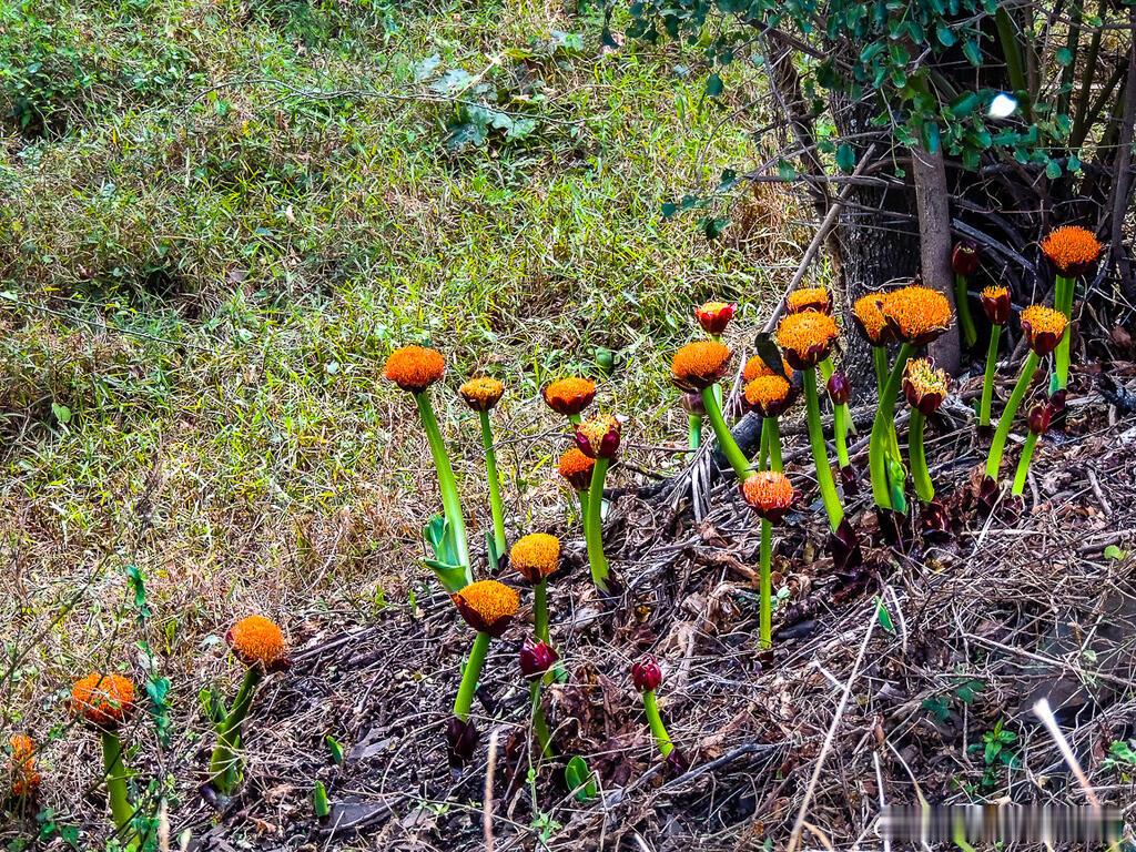 火焰网球花是夏型种,冬季落叶休眠,植株形态多样,花期却超长,从冬末能持续到秋季(南半球7-3月),开花时株高0.3-1.0米。根茎直立,上部膨大呈鳞茎状;叶片2-12枚,宽披针形或卵形,螺旋状排列有光泽,叶缘波状,叶柄状基部形成假茎还带着红褐色斑点。最吸睛的是伞形花序,刷状结构直径5-15厘米,花漏斗状,花被片橙红或红橙色,偶尔还有白色或淡黄色,雄蕊外露直立,花粉鲜黄色,像给花朵撒了把金粉🥰!结的浆果球形,红色或橙色很有光泽,种子球形或卵形呈白色。