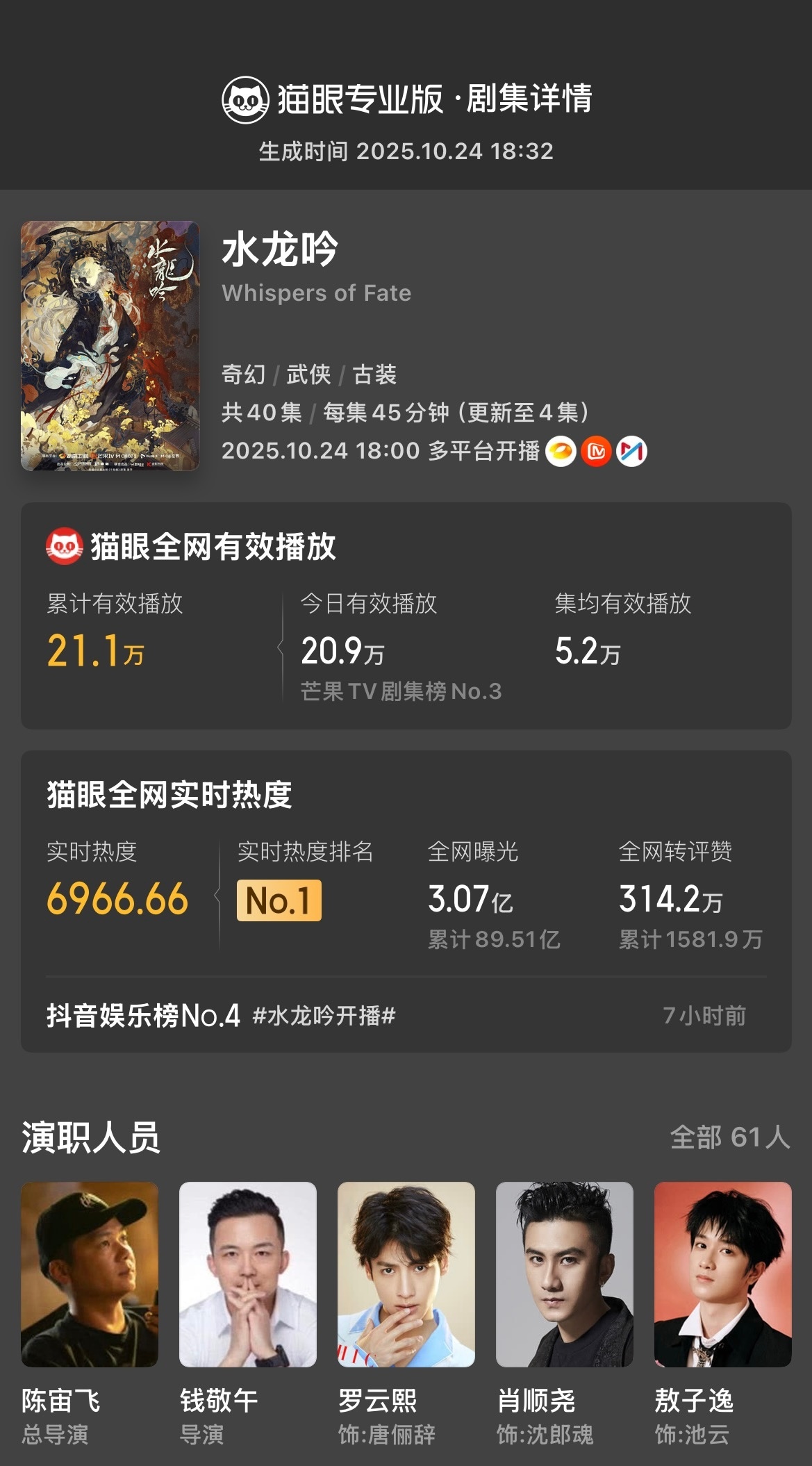 水龙吟首播实时热度登顶 据猫眼专业版数据,(按演员姓氏首字母排名)领衔主演的网络剧《水龙吟》开播30分钟,实时热度登顶猫眼全网热度榜!喜“吟”开播,邀你一起来看《水龙吟》!🔥 水龙吟开播30分钟实时热度登顶