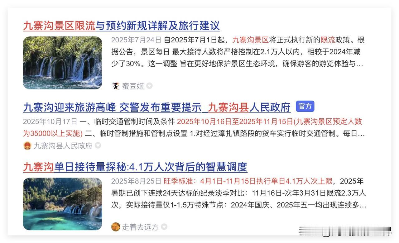 哎!我想问,九寨沟,旺季每天41000人次的限流,是不是可以改改呢?!2025年,九寨沟超级火爆,最近,10月金秋,经常提前很多天就买不到门票了啊! 41000人次的限流,这是好几年前就核算的结果吧?! 可是,现如今…… 九寨沟,能否旺季增加大巴车数量呢?! 不得不说,九寨沟,确实是中国一流,世界一流的风景……九寨沟的门票是绝对的物超所值! 九寨沟,也应该为当地经济发展,做出更大贡献啊! 来的都是客啊! 九寨沟,确实太美了!