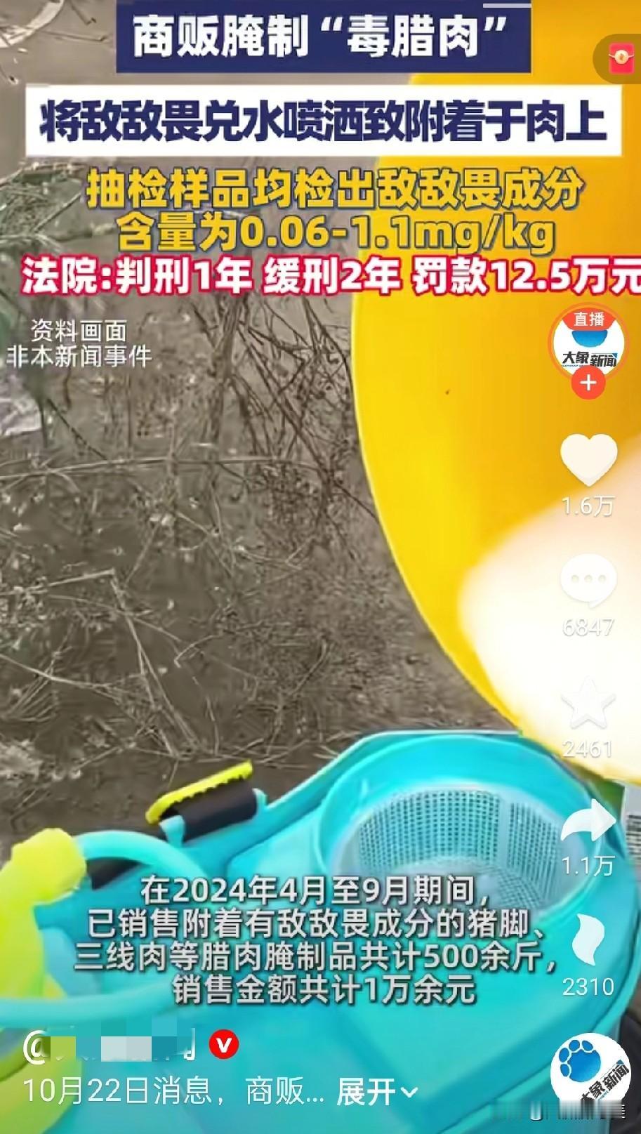你永远猜不到人心有多坏!为了钱什么丧尽天良的事都做得出来!这种人就应该遭天谴! 据记者爆料,一些不良商家在制作腊肉时为了防治蝇虫,居然将剧毒农药敌敌畏稀释后喷洒在腊肉上面!一个是给人吃的食品,一个是农田杀灭害虫的剧毒农药,谁也不相信能把两个性质完全相反的东西联系在一起,一些人为了钱真的可以昧良心!挣黑心钱! 强烈建议对这些人,不用判刑,不用惩罚,解铃还须系铃人,东西不能浪费,自己做的腊肉就让他们自己吃下去!全部吃完,强制执行!