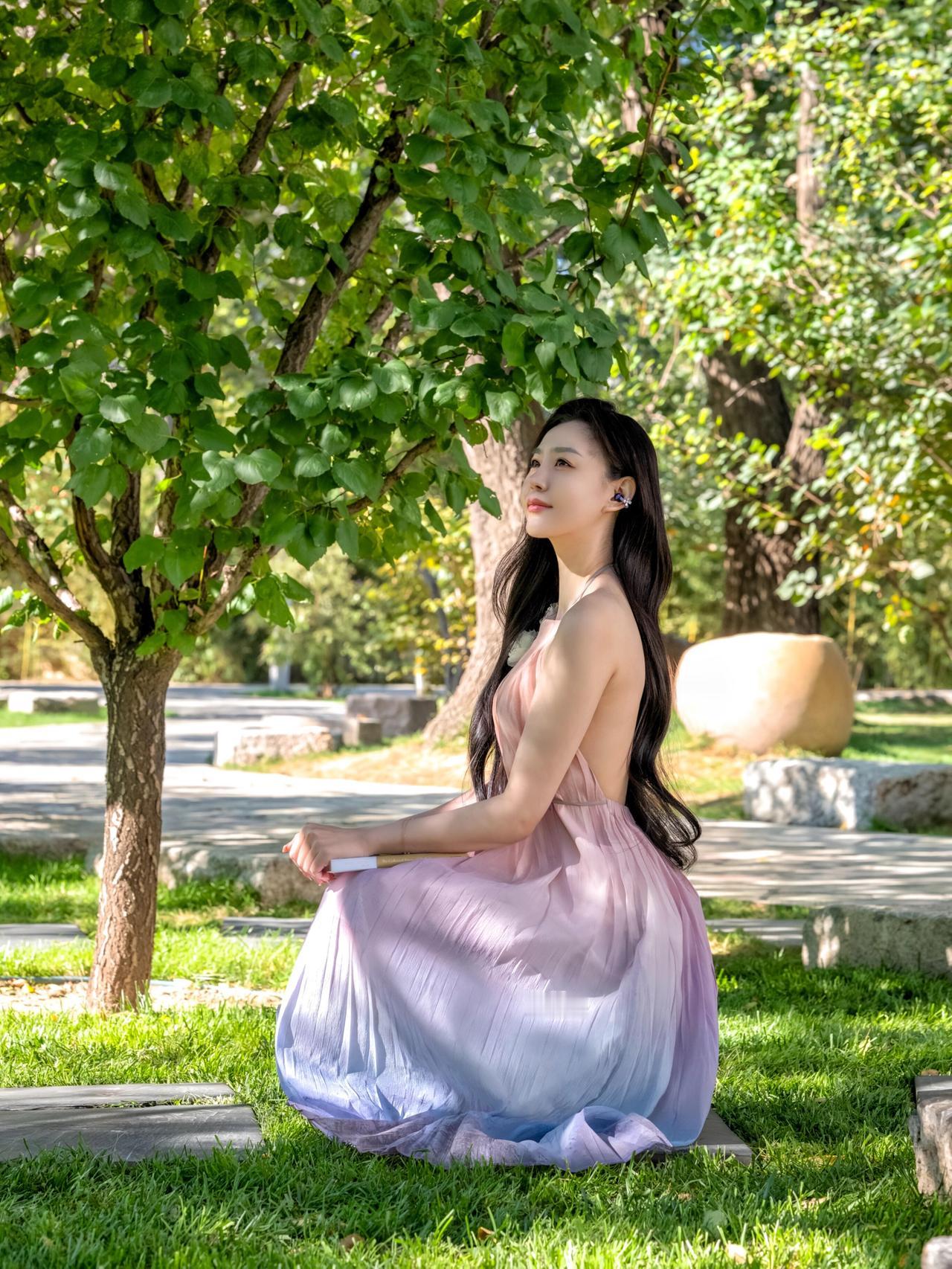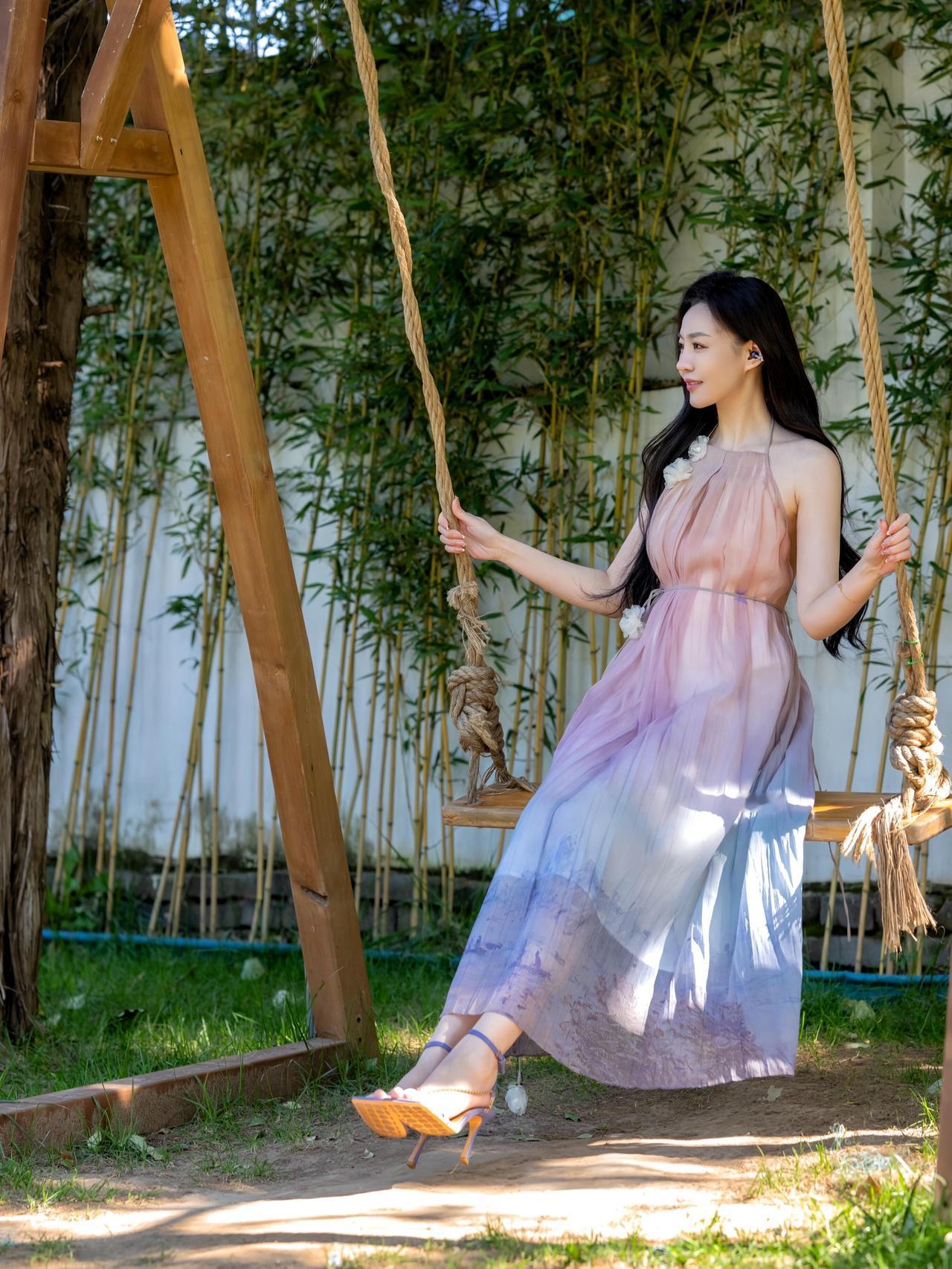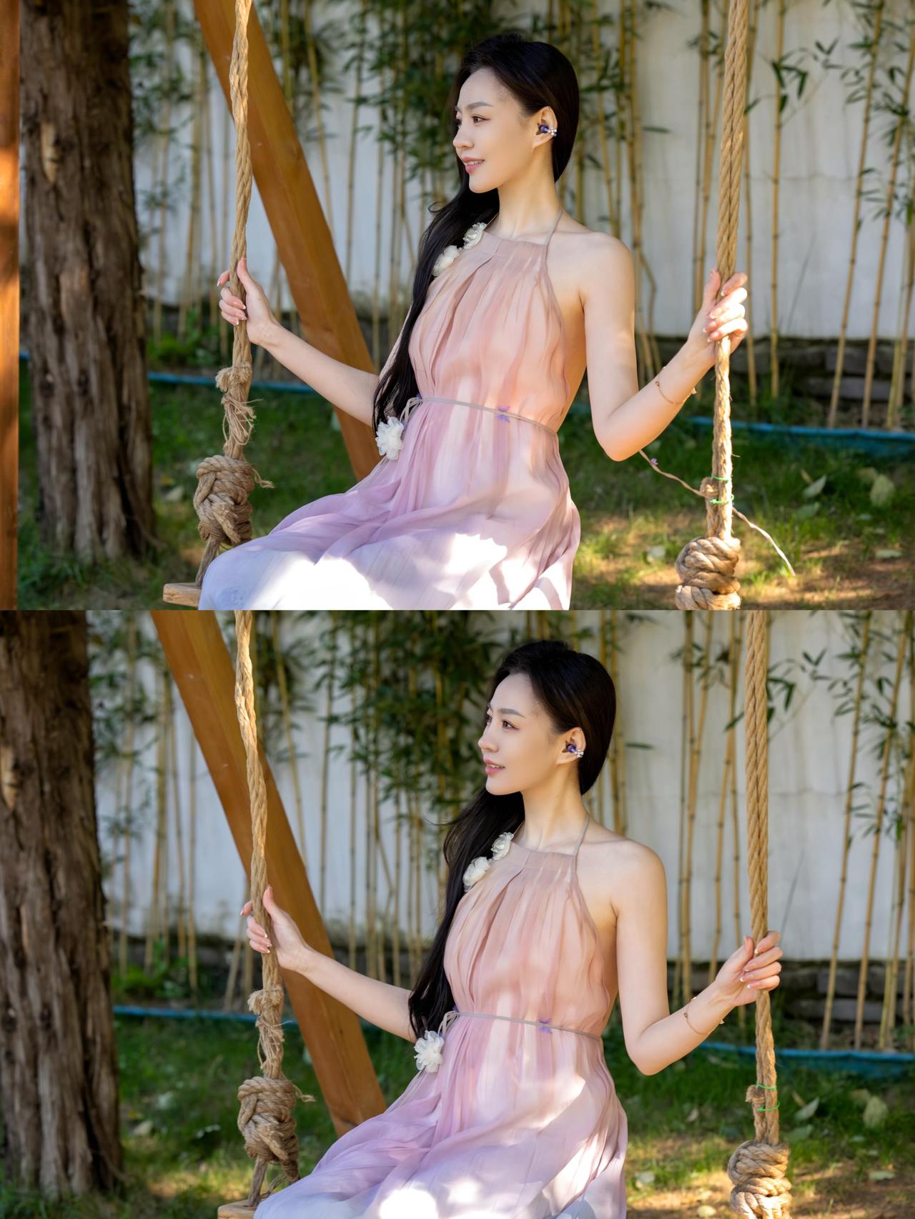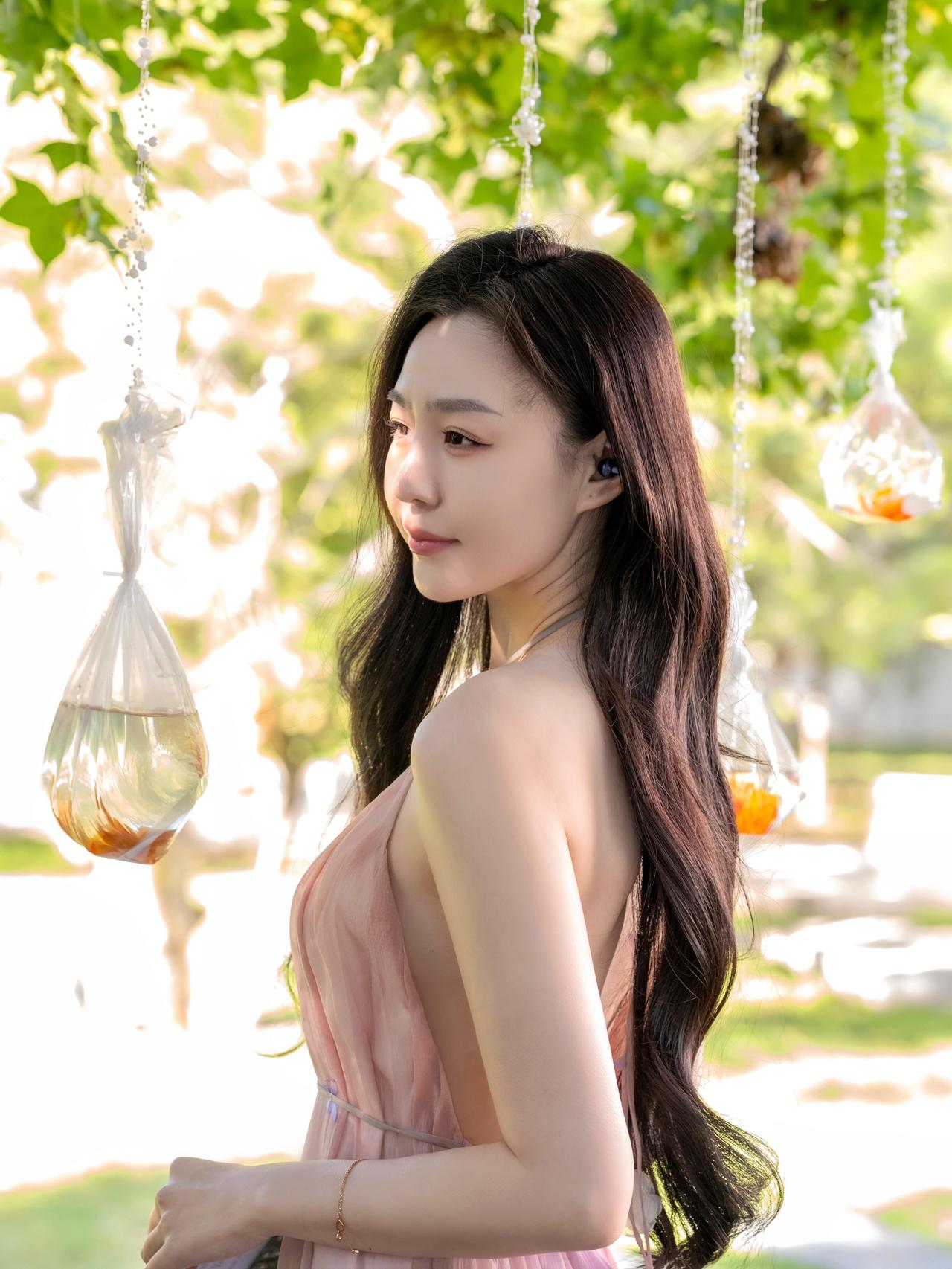 温柔粉裙少女,竹林间轻抚发丝,岁月静好。