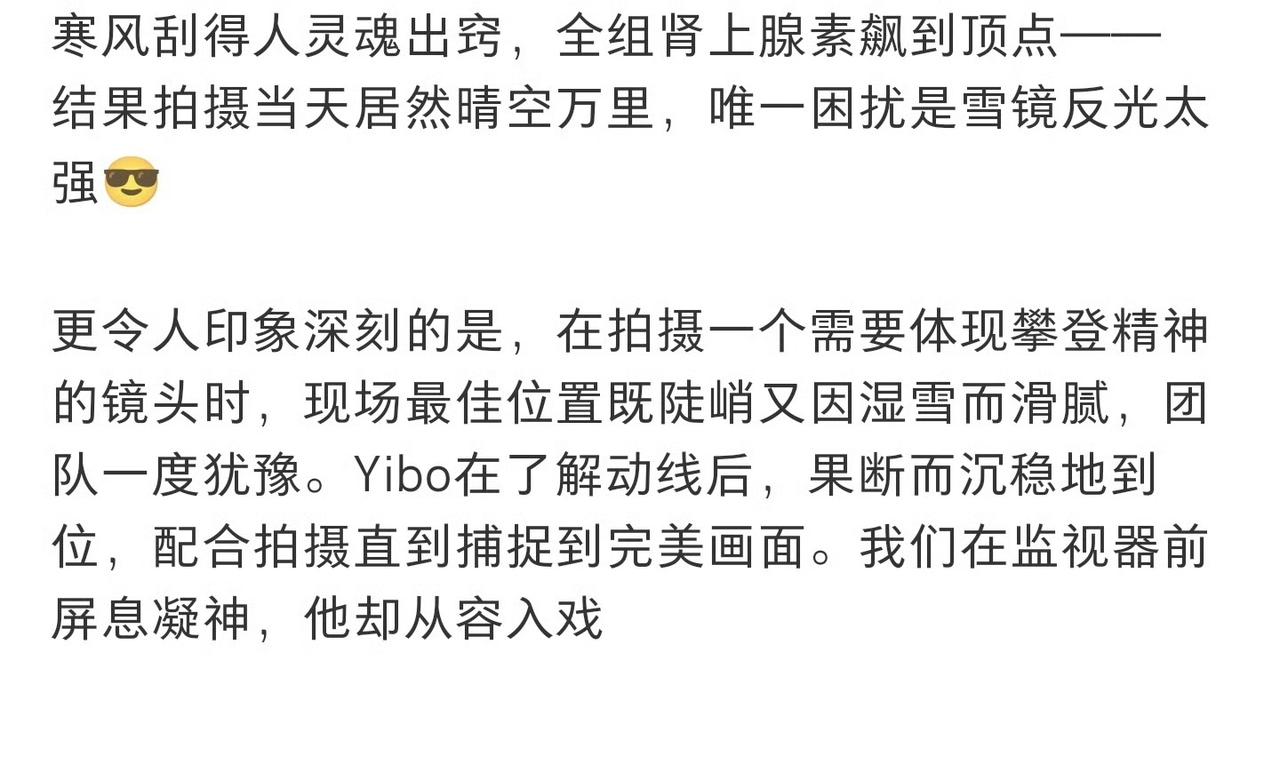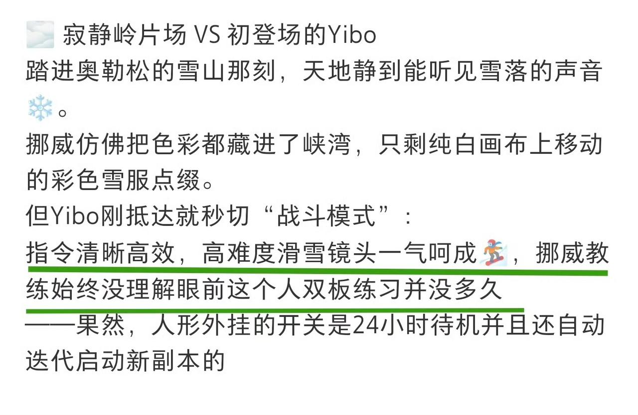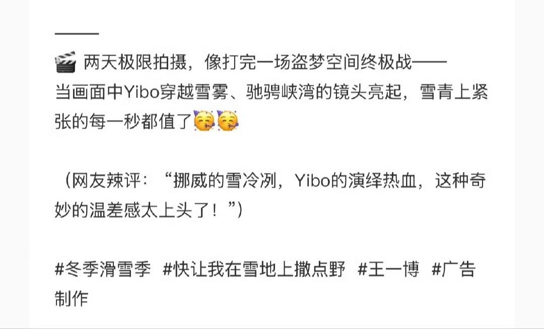 王一博的天赋和敬业第N次震撼合作伙伴。 海丽汉森雪山大片幕后团队提到王一博拍摄时:“指令清晰高效,高难度滑雪镜头一气呵成”“挪威教练始终没理解眼前这个人双板练习并没多久”。 “人性外挂的开关是24小时待机并且还自动迭代启动新副本的”“专注、敬业、思路清晰,现场被圈粉”“每一秒都值了”![赞][赞][赞] “现场最佳位置既陡峭又因湿雪而滑腻,团队一度犹豫。Yibo在了解动线后,果断而沉稳地到位,配合拍摄直到捕捉到完美画面。” 王一博已经无数次用自己过人的天赋和惊人的敬业征服了合作伙伴,而王一博的天赋究竟有多强?似乎远远没有上限……
