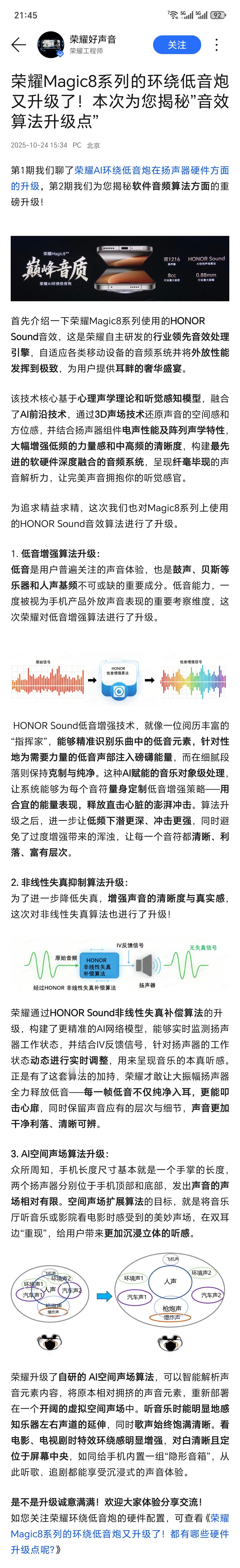 荣耀Magic8系列扬声器硬件升级,软件方面也升级1.低音增强算法升级2.非线性