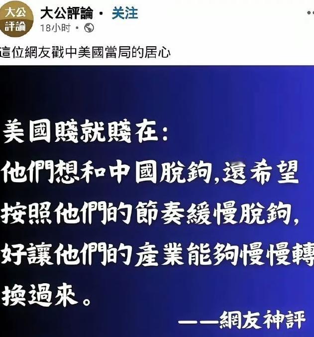 [微风]美国的想法是让中国脱钩慢一点,让美国的产业有重建的时间!但美国能卡中国的就立刻停掉,打算直接掐死中国同类产业,把中国变成一个美国产品的倾销地,但是中国怎么可能会让美国的如意算盘得逞呢? 这盘棋,美国下得极其精明,也极其自私。它的如意算盘,说白了就是一场精心设计的“慢刀子割肉”和“快刀子封喉”的组合拳。它希望跟中国的脱钩慢一点,慢到什么程度呢? 慢到足以让美国自己的产业有足够时间,从越南、墨西哥或者美国本土,把那些搬走了几十年的工厂再一点点重建起来。 这个过程不能太快,太快了,沃尔玛货架上空了,美国老百姓要骂街;苹果手机没地方造了,库克要跳脚。所以,得“慢”,得温水煮青蛙,让美国经济有个缓冲期,感觉不到那么疼。 但另一只手,美国却亮出了最锋利的刀,对着中国的要害,准备快刀斩乱麻。哪些是要害?就是那些中国还没完全掌握,但又被美国死死卡住脖子的核心技术。 比如最顶尖的光刻机、高端AI芯片、精密的工业设计软件。在这些领域,美国能卡住的,就立刻停掉,毫不手软,打算一招就把中国的同类产业摁死在摇篮里,或者锁死在现有的水平上。 它的终极目标很清晰:让中国失去产业升级的能力,永远停留在中低端制造业,然后乖乖地成为美国高科技产品的倾销地。你负责生产袜子、玩具,我负责卖给你飞机、芯片和操作系统,这生意多“完美”? 但这个算盘打得再精,也漏算了一个最关键的变量:中国自己会怎么想,又会怎么做。中国怎么可能眼睁睁地看着你把我的“升级之路”给堵死,然后让我心甘情愿地当你的“经济殖民地”? 这根本不可能。面对美国这套“慢+快”的组合拳,中国也打出了自己的应对策略,同样是一套组合拳,只不过招式完全不同。 面对美国的“慢脱钩”,中国选择的不是硬碰硬,而是“你打你的,我打我的”。你慢慢把你的低端产业链转移走,好,那我就在这些领域加速自动化和智能化升级,用更低的成本、更高的效率,让你转移出去的产业失去竞争力。 同时,我加速开拓新的市场,欧洲、东南亚、一带一路沿线国家,世界那么大,不只有你一个买家。你慢慢建你的“朋友圈”,我迅速扩大我的“合作圈”。 你试图用时间换空间,我就用速度换空间。当你的产业链还没完全重建时,我的新市场和新伙伴关系可能已经稳固了。这场“慢”的较量,比的是谁的耐力更强,谁的布局更广。 而面对美国的“快扼杀”,中国更是被逼到了墙角,只能选择“置之死地而后生”。你卡我芯片,那我就举全国之力去搞芯片。 这当然会非常痛苦,会走很多弯路,会花无数冤枉钱,但这是唯一的生路。从设立千亿级别的国家大基金,到动员顶尖高校和科研院所攻关,再到鼓励民营企业投身其中,中国正在用一种“不计成本”的方式,去啃那些最硬的骨头。 这就像一个武林高手被人废掉了内力,他只能从最基础的马步、吐纳开始,一点一滴地重新修炼。这个过程虽然痛苦,但一旦练成,他的根基会比以前更扎实。美国以为的“封喉一击”,反而可能逼出了一个在核心技术上完全自主的中国。 更重要的是,中国手里也握着几张牌,让美国不敢把事情做绝。比如稀土,美国的高科技产业离不开它,但中国的加工技术全球领先。 你敢在芯片上彻底断供,那我就敢在稀土供应链上给你找点麻烦。还有庞大的市场,特斯拉、苹果、通用汽车,这些美国巨头在中国的销售额是其全球利润的重要来源。 你若真的想置中国于死地,那这些跨国巨头第一个不答应,他们会反过来给美国政府施压。这是一种“伤敌一千,自损八百”的威慑,虽然痛苦,但在关键时刻,却是保命的底牌。 所以,这场所谓的“脱钩”,根本不是一场简单的经济分离,而是一场关于未来全球产业链主导权的生死之战。美国想通过一场可控的“分手”,来维持自己的霸权地位;而中国则要在这场风暴中,强行完成一次痛苦的“蜕变”,打破枷锁,掌握自己的命运。 这已经不是谁算计谁的问题了,而是两条不同发展道路的激烈碰撞。那么,在这场意志与实力的漫长较量中,你觉得美国这种“精于算计”的策略,最终会得逞吗? 还是说,中国这种“被逼出来的绝地反击”,反而能开创出一个全新的格局?这盘棋的结局,恐怕将决定未来几十年的世界面貌。