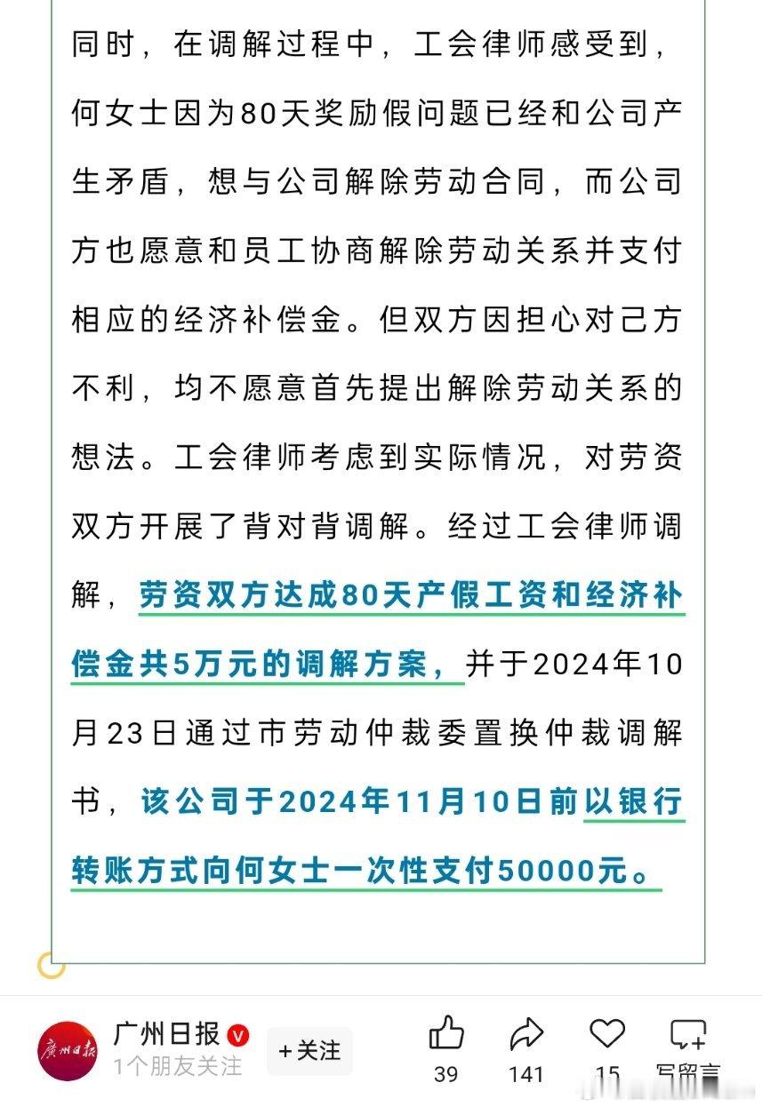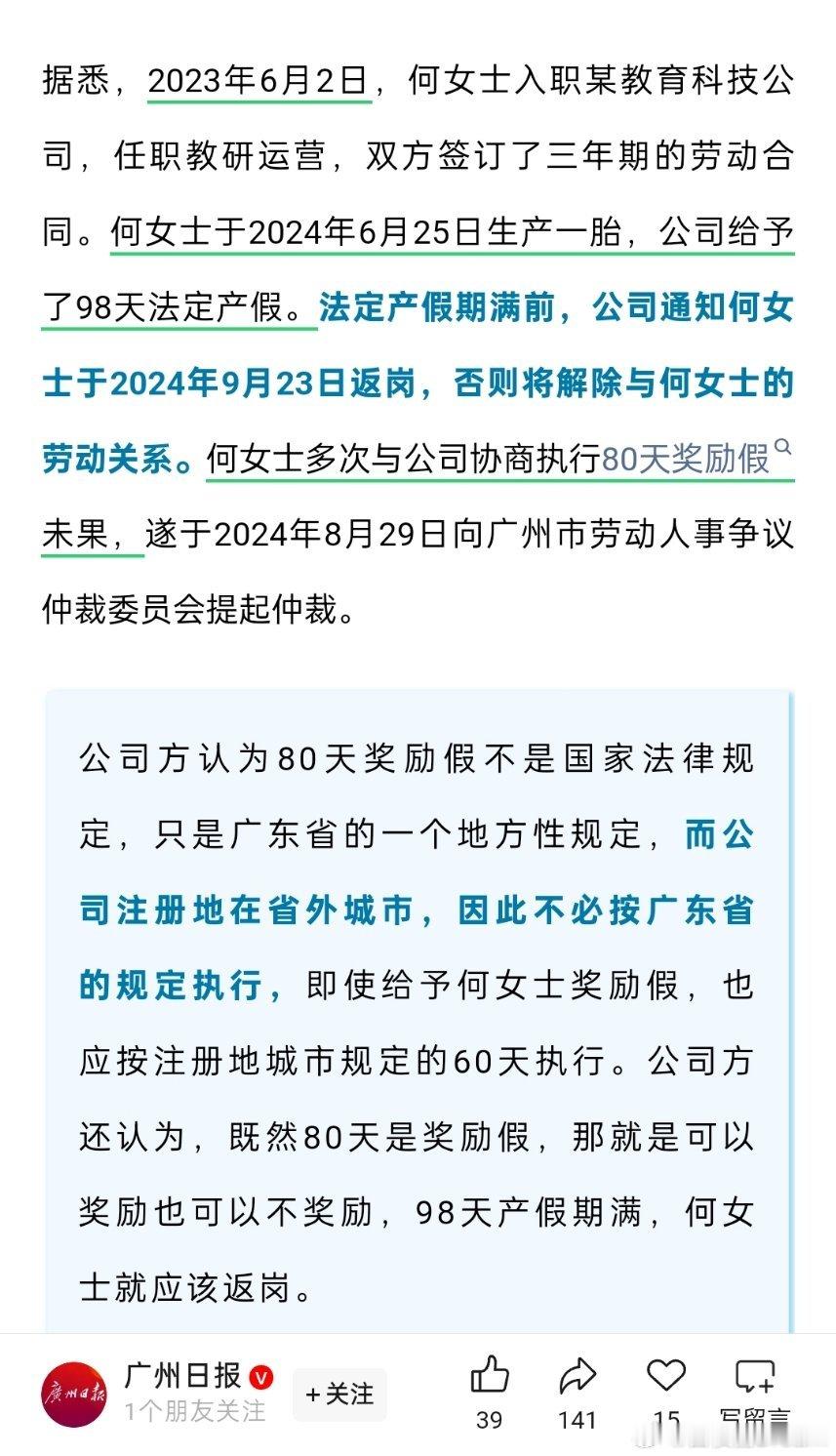 🔻广东一公司给予了98天法定产假,但是不批80天生育奖励假,女子维权获5万元补偿。