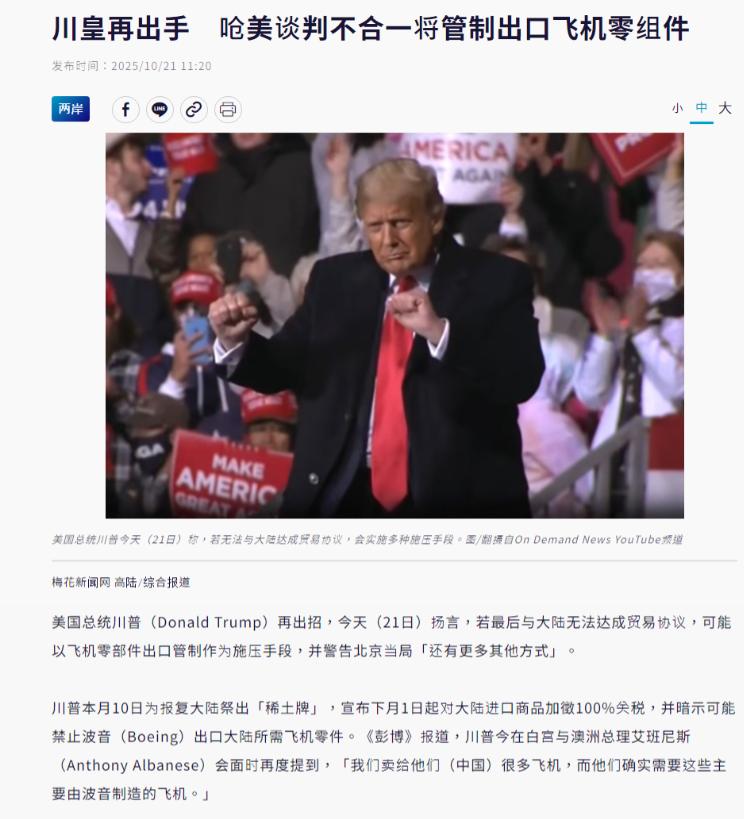 [微风]波音:这是嫌我死得还不够快吗?特朗普要祭出超级大招了!如果中美无法达成贸易协议,美国将禁止对中国出口波音飞机零配件,中国如何规避美国这个40米的长刀? 10月9日,中国商务部公布了一份堪称“王炸”的管制清单,将稀土、相关产业链设备、超硬材料甚至锂电池都纳入了严格的出口管制。 这记重拳还没让美国完全回过神来,第二天,10月10日,特朗普就立刻扬言要祭出“超级大招”,不仅要对中国加征100%的关税,更要直接禁止波音飞机以及零部件出口中国。 这一刀,又快又狠,直插中国的软肋,但同时也可能是在波音已经流血不止的心口上,又补了一刀。 这已经不是简单的贸易摩擦了,这简直就是一场“你打你的,我打我的”的极限对决。中国打的是“工业维生素”,是高科技产业的命根子;而美国打的是“空中动脉”,是中国庞大民航机队的生命线。 特朗普这招“禁止波音零部件出口”,听起来就像一把悬在中国头顶的40米长刀,威力巨大。中国目前拥有全球规模最大的波音机队之一,数千架飞机每天都在天上飞,运送着旅客和货物。 这些飞机就像一个精密的人体,需要定期“体检”和“换零件”,才能保证安全。一旦美国切断零部件供应,就意味着这些飞机的维护、修理和大修(MRO)将陷入停滞。 小到一个传感器,大到发动机叶片,只要是用波音原厂件的,都拿不到。时间一长,这些价值连城的飞机,就可能因为缺少关键备件而被迫停飞,变成一堆无法动弹的钢铁。 这对一个国家的经济和民航安全来说,是无法承受的打击。 面对这把明晃晃的长刀,中国如何规避?难道就只能束手就擒吗?当然不会。中国的应对之道,可能会分为三步走,每一步都充满了无奈和智慧。 第一步,也是最现实的“拆解之道”。说白了,就是“拆东墙补西墙”。中国拥有庞大的飞机“坟场”和退役飞机储备,完全可以从中挑选出同型号的飞机,将其完好的零部件拆解下来,经过严格的检测和认证后,用作现役飞机的维修备件。 这就像修理一辆老款汽车,找不到原厂配件,就去报废车场里找一辆同款车拆零件。这种方法虽然技术上可行,但成本高、效率低,而且存在一定的安全隐患和适航认证的难题。但这在生死关头,是保证机队不断航的最后一道保险。 第二步,是加速“替代之道”。世界不止有波音,还有空客。事实上,在过去几年的贸易摩擦中,中国已经将大量的订单转向了欧洲的空客。 这不仅包括新飞机的采购,也包括与空客建立更深入的合作,在中国本土建立更完善的维修和零部件供应体系。 同时,中国自己的大飞机C919也在加速追赶。虽然C919目前在规模和成熟度上还无法与波音737系列抗衡,但它的存在,本身就是一种战略威慑和未来的希望。通过扶持国产和引入竞争,中国正在逐步摆脱对单一供应商的依赖。 第三步,也是最根本的“自强之道”。这场危机,将成为中国航空工业发展的最强催化剂。美国用波音零部件作为武器,恰恰让中国彻底清醒地认识到,核心技术是买不来的,也是求不来的。 未来,中国必然会投入天量的资金和资源,去攻克航空发动机、航电系统、先进材料等一个个“卡脖子”的难关。 这个过程会非常漫长,甚至需要几代人的努力,但这是唯一能彻底摆脱那把“40米长刀”威胁的根本办法。今天的困境,正在为明天一个完全自主可控的中国航空工业铺路。 而在这场博弈中,最悲情的角色莫过于波音。中国是波音全球最大的市场,没有之一。失去中国市场,对波音来说不是简单的损失,而是毁灭性的打击。 更讽刺的是,波音自身正深陷737 MAX的安全危机和质量丑闻中,本来就步履维艰。特朗普这一“助攻”,等于直接把波音推向了悬崖边缘。 欧洲的空客会乐呵呵地接手波音留下的所有市场空白,而中国的C919也会获得宝贵的喘息和发展空间。美国想用波音作为武器来打击中国,结果却发现,这把武器最先刺穿的,可能是自己国家最伟大的工业象征之一。 那么,在这场没有硝烟的战争中,这种“杀敌一千,自损八百”的相互毁灭策略,真的能逼对方屈服吗? 还是说,它只会加速一个两极分化世界的到来,一个以美国技术为核心,一个以中国技术为核心,彼此平行、互不兼容?当合作的桥梁被一个个炸毁后,我们剩下的,除了对抗,还有什么呢?