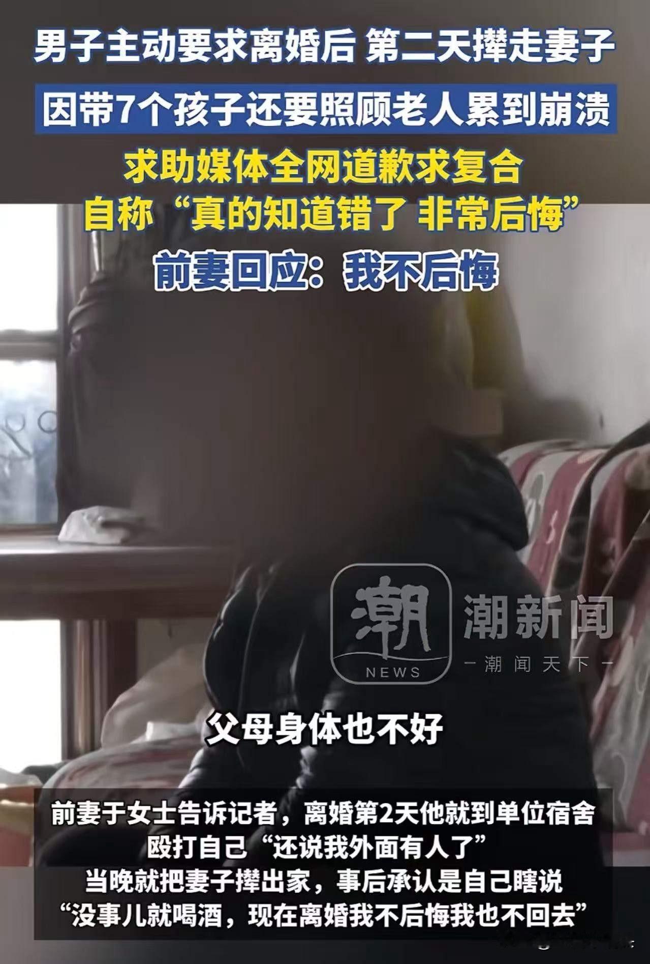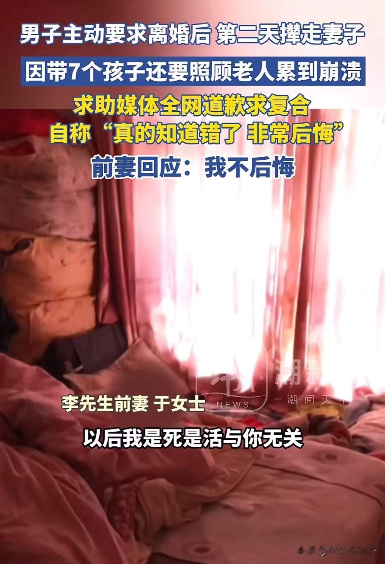 河南郑州,男子主动要求离婚后,因带7个孩子还要照顾老人累到崩溃,全网道歉“求复合”!男子:“老婆,我真的知道错了,非常后悔!”前妻回应:我不后悔!网友:他不是后悔了,他是没有免费保姆了! 河南郑州,一场看似普通的家庭变故,却在网络上掀起了轩然大波。男子主动提出离婚,本以为这是他一时的冲动,没想到事情的真相远比表面复杂得多。带着7个孩子、照顾年迈的老人,这个男人的生活像是一场没有休止的马拉松。每天早出晚归,疲惫不堪,他的身体和心灵都已到崩溃的边缘。 然而,就在他决定“放手”的那一刻,事情却发生了戏剧性的转变。全网开始为他鸣不平,纷纷谴责“他是不是不爱了”,甚至有人为他喊话“求复合”。男子在网络上深情表白:“老婆,我真的知道错了,非常后悔!”仿佛一场情感的戏码在上演,但真相又是什么? 前妻的回应却让人心碎:“我不后悔。”这句话简单而坚决,似乎在告诉所有人:她的选择不仅仅是因为感情的变淡,更是因为背负的责任太重。她用行动证明:家庭的责任,远比一时的情感更沉重。 这场家庭风暴背后,折射出的是无数普通家庭的真实写照。谁都说“男人要担当”,但谁又真正理解那份责任的重量?那些日复一日的操劳,背后隐藏着多少未被看见的辛酸?男人的崩溃,是软弱吗?还是社会对家庭角色的无形压力? 更令人深思的是,网络上的道歉和“求复合”,究竟是真心的悔意,还是对失去的“免费保姆”角色的惋惜?当我们站在旁观者的角度,是否也曾忽略过家庭成员背后的辛苦?是否也曾用标签和指责,掩盖了那些沉甸甸的责任? 这不仅仅是一段家庭的故事,更是一面镜子,映照出当代社会对“责任”与“爱”的认知。或许,我们都应该停下来,问问自己:在这个快节奏的时代,家庭的意义到底是什么?我们是否也在无形中,把“责任”变成了“负担”,让那些最需要理解和支持的人,变得孤独无助? 这场风波,或许只是一个家庭的缩影,但它引发的共鸣,却远远超出了家庭的范畴。它让我们反思:在追求个人幸福的同时,是否也该学会承担,学会理解,学会用心去守护那些最值得珍惜的人。因为,家庭的温暖,从来都不是一时的情感冲动,而是日复一日的责任与坚持。 离婚带八个娃