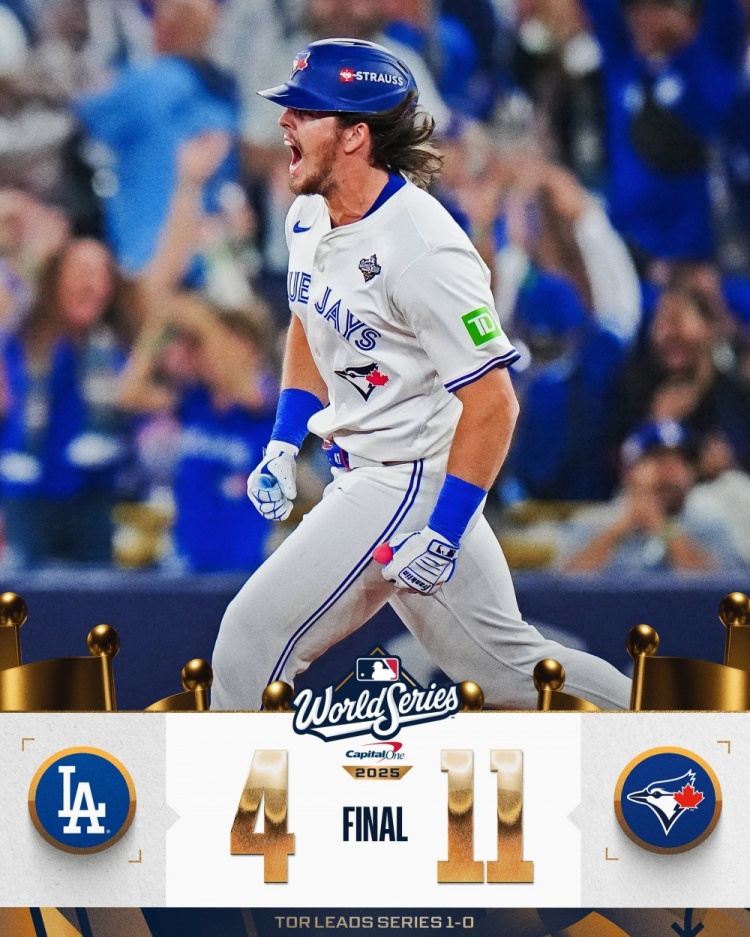 直播吧10月25日讯MLB世界大赛(总决赛)G1,多伦多蓝鸟主场11-4大胜洛杉矶道奇先下一城(7局4胜制)。