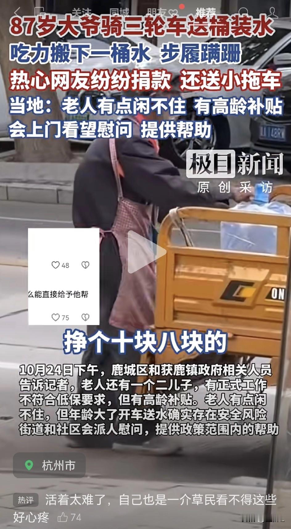“闲不住”的87岁送水工:被全网心疼后,我们该如何安放他们的晚年? 10月21日,河北石家庄的聂大爷,最近成了网络上的热议人物。 原来,聂大爷今年已经87岁的高龄,因为原本承担送水工作的50多岁的儿子患病,行动不便无法再送水,聂大爷就主动接过儿子的工作,替儿子送水来补贴家用。 尽管儿子多次劝阻聂大爷送水,但聂大爷觉着自己身体还硬朗,哪怕每天挣个十块八块的,也能贴补家用。 送水的聂大爷被好心博主把视频发到网上以后,很快就引起了广大网友的关注。 更有热心网友通过博主转发善款,购买便携拖车以减轻大爷送水的负担,还有人提出愿每月资助1000元。 而镇政府相关工作人员表示,他们也关注到了聂大爷的事情,因为聂大爷还有一个二儿子,有正式的工作,所以大爷不属于低保的范畴。 但聂大爷有高龄补贴,老人有点闲不住,只是年龄大了开车送水确实存在安全风险,会派人上门看望慰问,提供政策范围内力所能及的帮助。 网友们的心疼和善心令人感动,聂大爷高龄送水,对聂大爷来讲,是他疼爱患病儿子的心意,是他老当益壮的信心,他在凭自己的力气努力地托举患病儿子。 其实,他不可怜,在他如此高龄,还可以用自己的行动为儿子做点事,能被儿子所需要,他的内心是火热的,也是幸福的。 只是,毕竟已经87岁高龄,送水这个工作确实有点危险。或许大爷可以考虑换一个轻快一点的工作,贩卖蔬菜、捡拾废品等等。 其实他们那个年代的老人很多都闲不住,即便高龄,依然奔波在努力挣钱的路上。 我婆婆已经77岁了,依然一年四季种菜、卖菜,春季还会到处挖野菜去卖。家里的土地大块的都承包给别人了,但她留了三分自留地,留着自己种菜。 说过很多次,不让她种菜种地了,生活费会给她,她只要每天跟着别人跳跳舞,好好生活就行。 但她认为自己种菜卖菜就是锻炼身体。家里乱的下不去脚,她看不见,但唯独地里的活一点也不能耽搁。 让她跟着我们生活,从来就没妥协过,一个人过的轻松自在。 头天傍晚去摘菜,晚上捆绑好,第二天一早去城里卖。除非下雨,否则一天不落。 她觉着自己这样活的充实,自己过的开心,每天挣那么几十块钱,就开心的不行。但她也不花,也花不着,就攒着,哪个儿子回家,就塞给哪个儿子,就跟小时候给孩子们零花钱一样。 婆婆给钱的时候很骄傲,不接就会生气。我们月初会给她转生活费,她也不提出来,等到过年,再全提出来,加上自己的,就是孩子们的压岁钱。 后来,我们也就随她去了,但约法三章,不能逞强,一切要以自己的身体为主。 操劳了一辈子的老人,其实他们很怕自己没用,但凡还能帮到儿女,但凡还能劳作的动,他们的精气神就是好的,身体就无恙。 既如此,就随他们去吧,能力范围内,由他们折腾。毕竟,生命就在于折腾,不是吗? 尊重他们,直到有一天他们折腾不动了,我们再接手。 信息来源于钱江视频,侵联删!