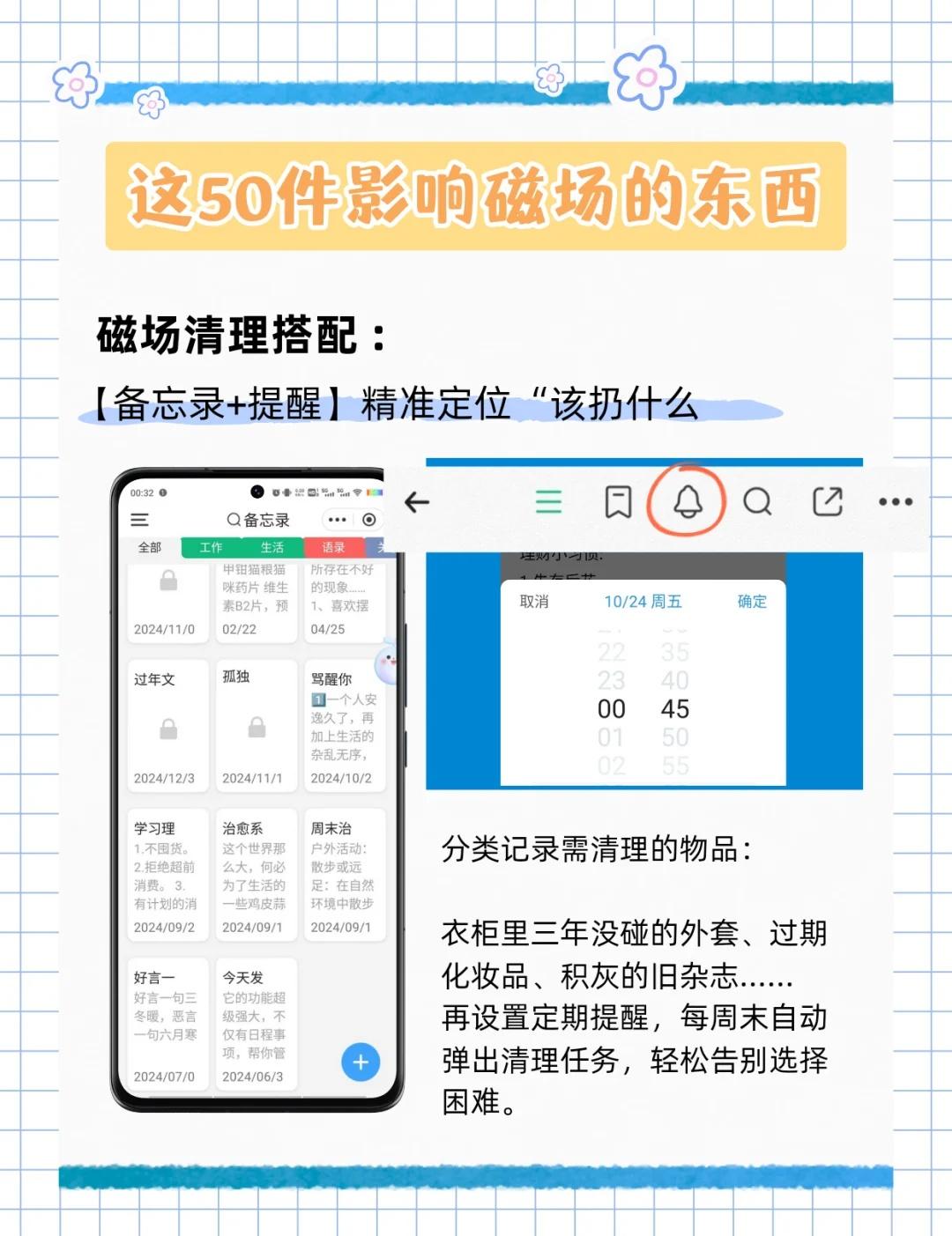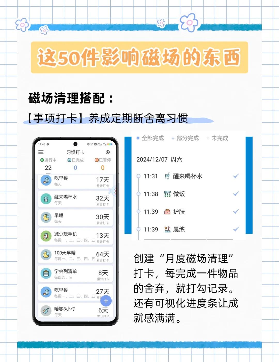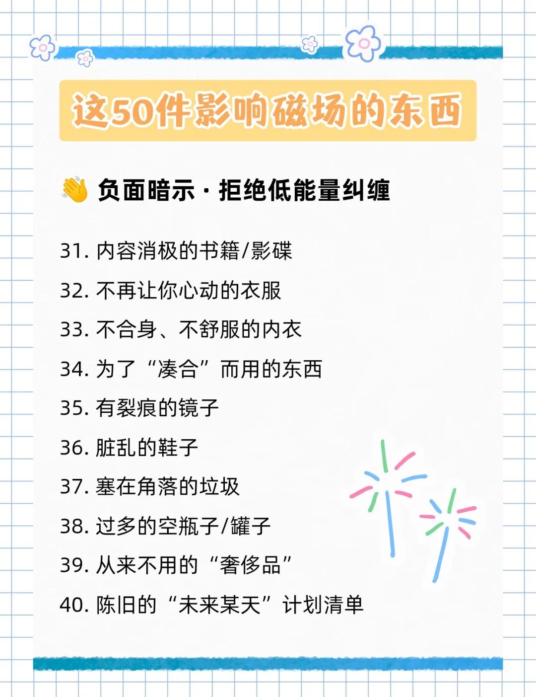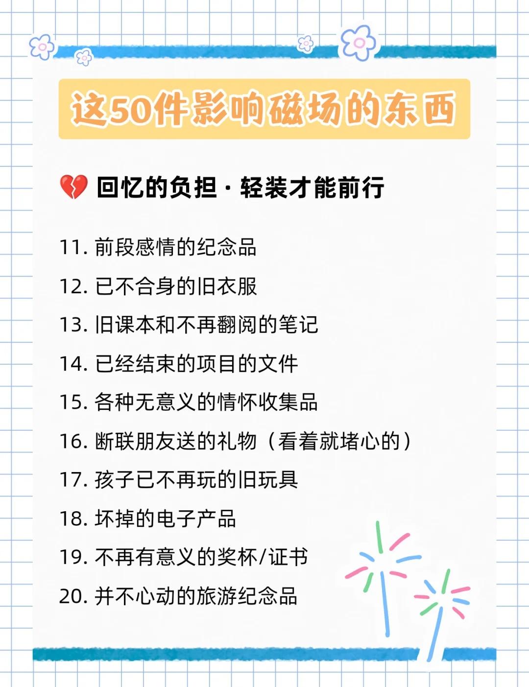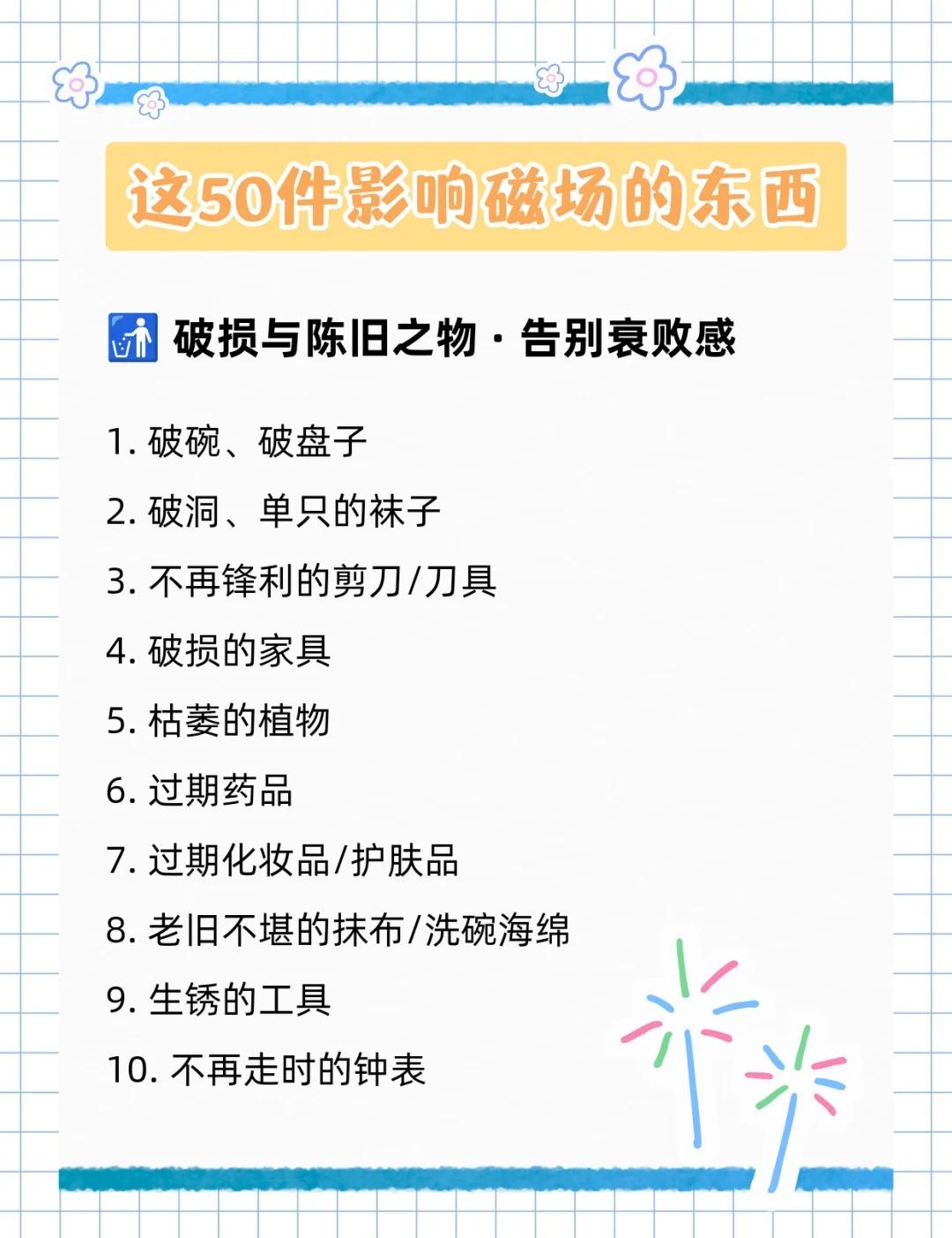 别让物品拉低磁场‼️这50样东西直接扔🧐 大家好,我是小序[亲一个R] 姐妹们,有没有觉得最近总是提不起劲 做什么事都卡卡的❓ 也许不是你不努力 而是身边的“物品能量”在悄悄拖后腿‼️ ⁻ 清掉那些拉低你能量的杂物📦 真的会感觉整个人轻松很多 好运也会跟着来哦🍀 ⁻ 今天小序整理了这份【必扔清单】📝 来和我一起给生活和能量场做个大扫除吧!👇 ⁻ 🚮 破损与陈旧之物 💔 回忆的负担 🗑️ 杂物与囤积 👋 负面暗示 💫 空间能量阻碍 ……更多详细内容请看图↑ ⁻ 以上就是小序今天分享的内容啦~ 不用急着一天全部清完 每天整理一个类别 慢慢感受身心的变化✨ ⁻ 记得对每件物品说声“谢谢” 然后,安心地放手~ ⁻ 整理完之后,别忘了开窗通风💨 让新鲜的能量流动进来! ⁻ 你会发现,房间变亮了🌿 呼吸顺畅了,整个人都神清气爽😌 运气,也会越来越棒~ 不信的话,试试看!💐 - 微习惯 自我管理 极简生活 磁场 高磁场高能量 扔掉家里三分之一的物品 生活断舍离 宝藏APP 时光序