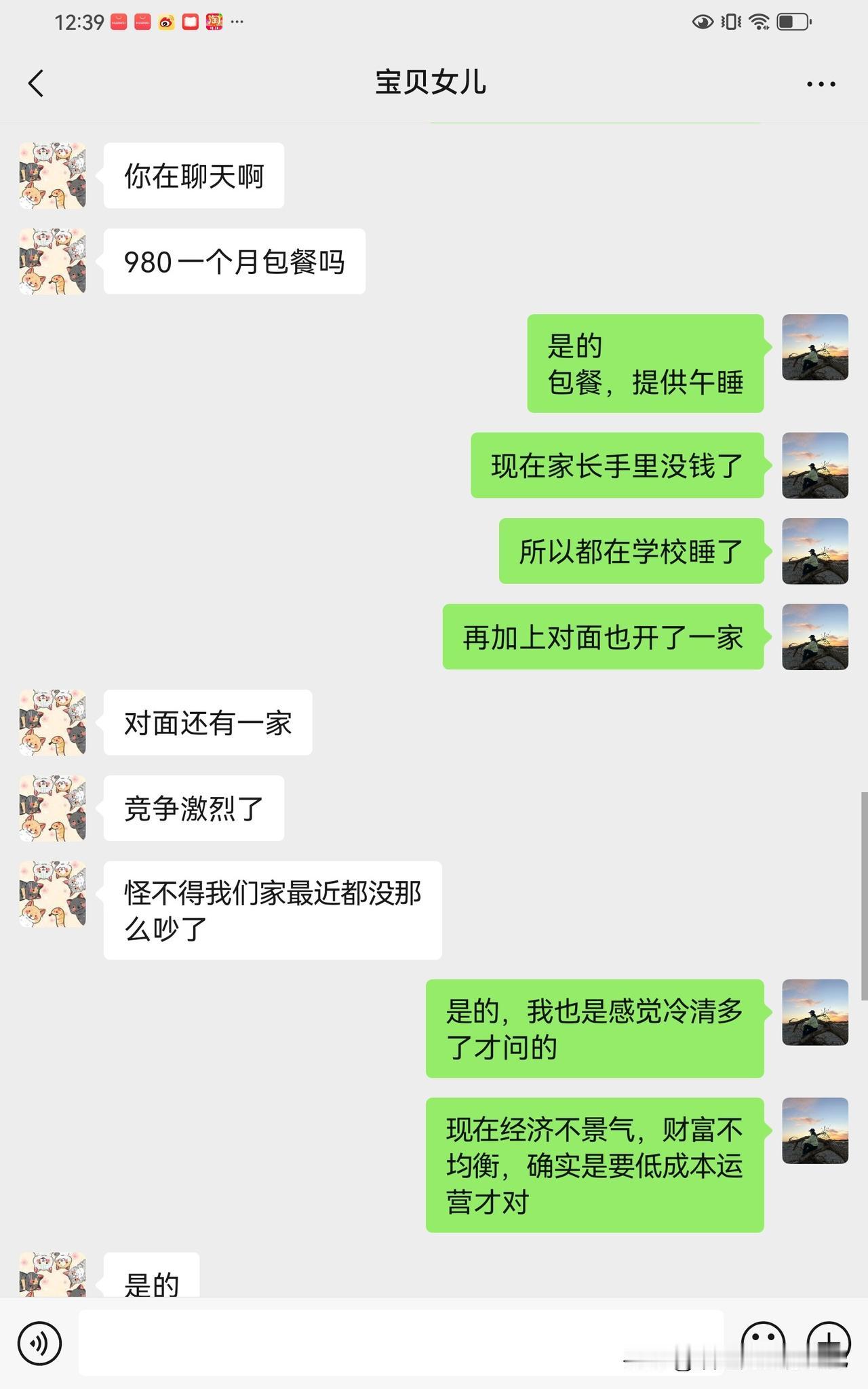 我就想问一下,你们家的兔崽子是不是也不想生小孩?我们就女儿就是这个理念! 隔壁邻居的房子租了做小学生托管班,我发现这个学期开学后托管的学生少了好多,和老师聊天才知道现在家长手里没钱了,托管班要980元一个月,学校是980元一个学期,好多家长就让孩子在学校吃饭在教室休息! 和女儿聊天说起这个,原来是想和她说做项目要低成本运营,现在经济不景气,装修购置设备留余地,等等!结果她对我说,不生小孩,低成本运营自我人生!觉得生小孩是累赘!我不仅开始自我怀疑,难道我送她出国读书7年错了?和中国的传统理念背离了? 记录真实生活 托管班经营 养娃经济 托管小孩