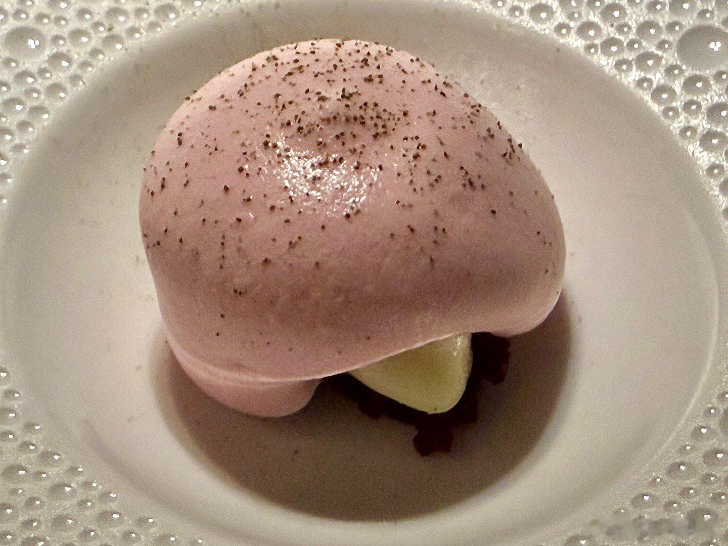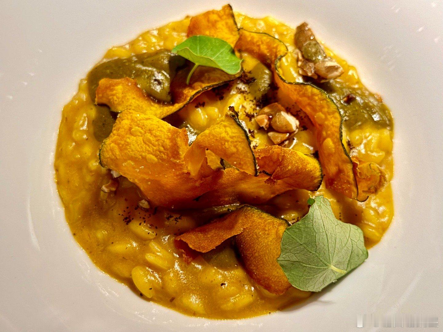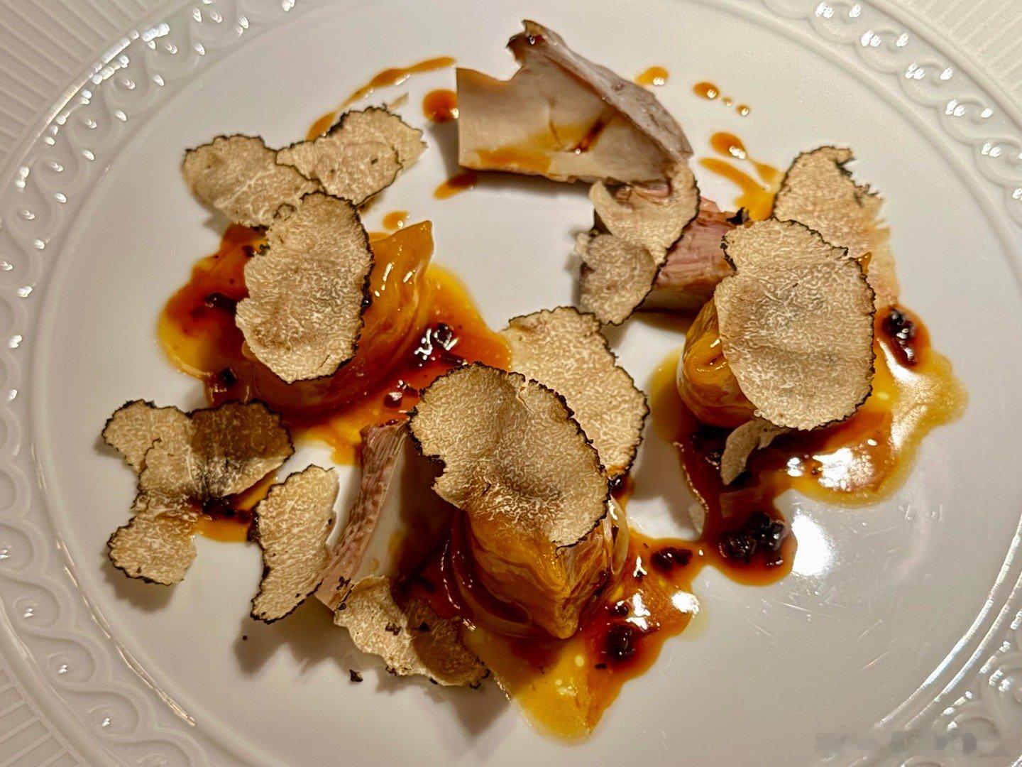图5是“Saor”南瓜烩饭,配洋葱、葡萄干与咖啡粉。一道酸甜口的南瓜饭,还挺好吃的。图6是利沃诺小公鸡饺子配圣米尼亚托黑松露、姜与腌制卡多切利蘑菇。浓香可口,很好吃。