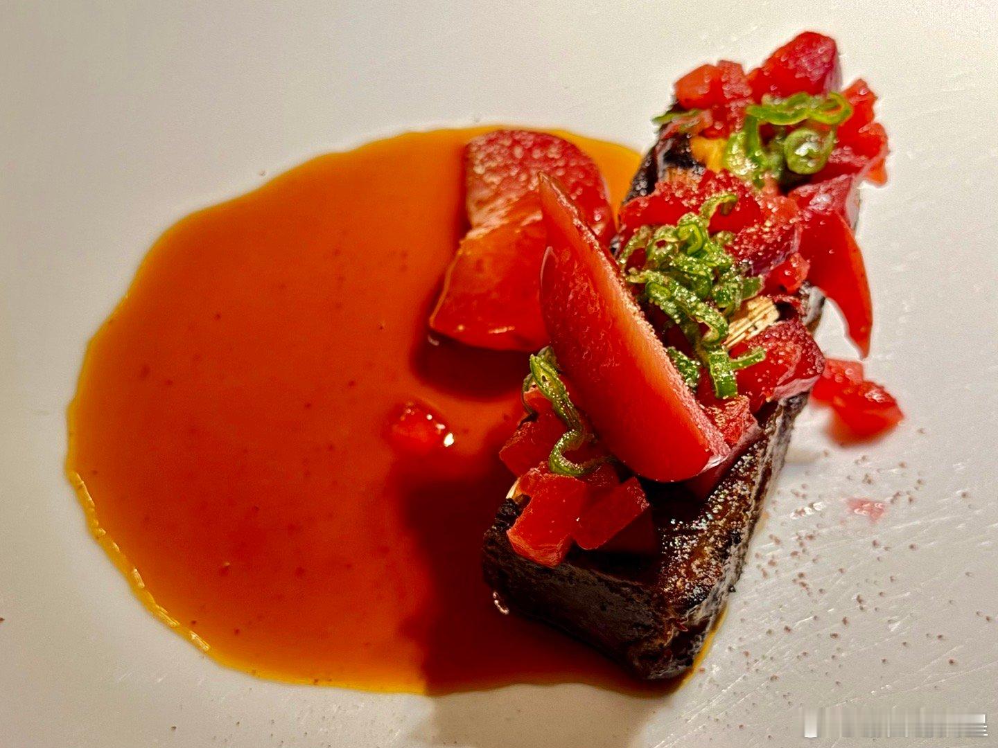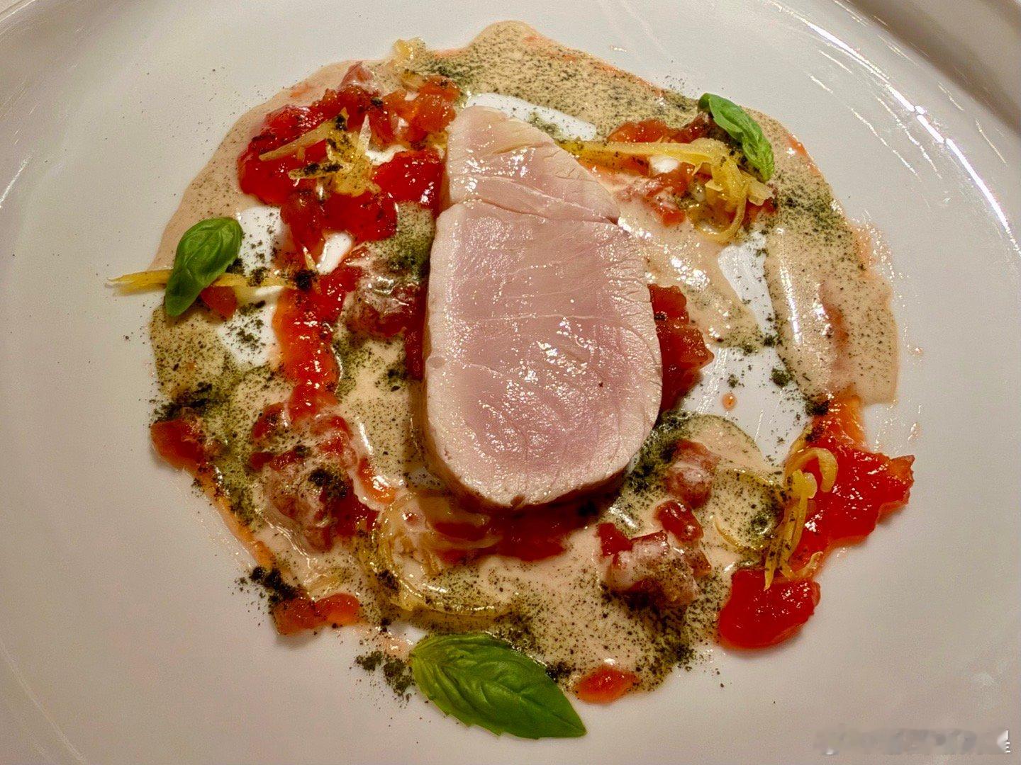 图3是甜酸甜菜千层酥,配烤杏仁与黑樱桃,确实是酸甜口的。图4是轻煎第勒尼安海鲹鱼,配佩科里诺“Baccellone”甜酱番茄与酸柠檬。