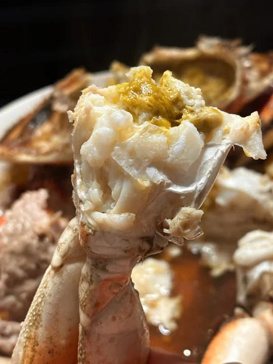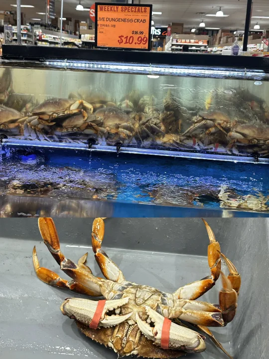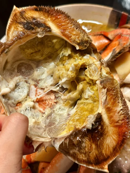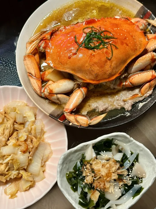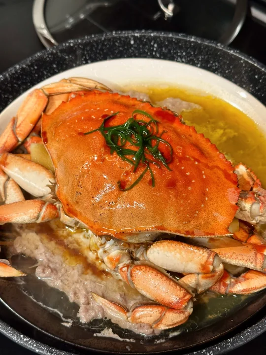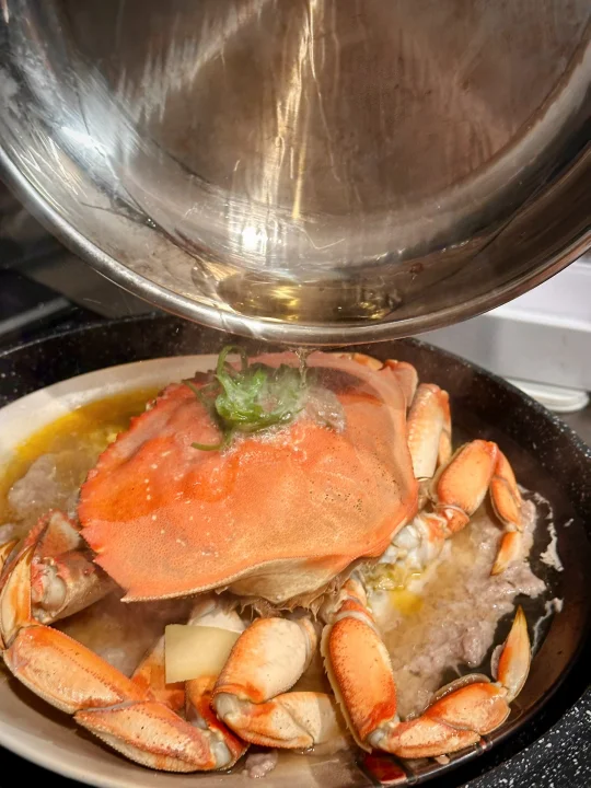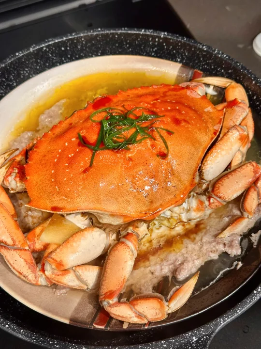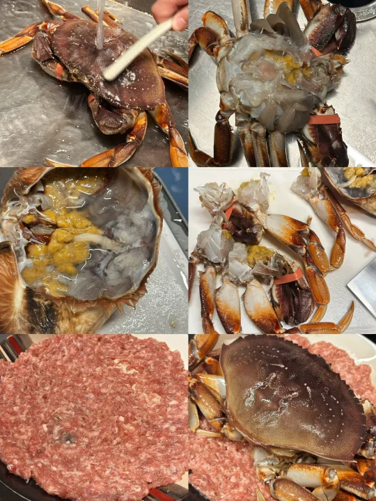 最近应该是珍宝蟹Dungeness Crab的季节了吧!无论是Costco还是Hmart都在折扣力推,比起Costco的熟制,自然是hmart鲜活的更得我心。看到珍宝蟹从水池里捞出后,在台面上挥舞着钳子耀武扬威,我就能想象它有多好吃! - 做了珍宝蟹蒸肉饼,比我想象中还要美味!这个季节的螃蟹相当肥美健硕,蟹肚蟹钳蟹腿里都满满的肉。因为足够鲜活,所以只要简单清蒸,就足够甘甜好吃。 原本对海蟹的膏黄不抱期待,但铺在肉饼上蒸以后,肥美有嚼劲的猪肉吸收了蟹黄的精华,好吃绝了!啃一口蟹肉,夹一筷子肉饼,再无比珍惜地用盘底蒸出的鲜美汁水拌米饭,我感觉我体会到了沿海人民的快乐! - 📒食材 珍宝蟹一只,姜两片,葱一根,食用油适量,蒸鱼豉油适量; 猪肉末150-200克,生抽,料酒,鸡粉,葱姜水。 - 📖做法 猪肉末加生抽,料酒,鸡粉和葱姜水搅拌均匀上劲,在冰箱里冷藏备用,可以比平时肉馅味道淡一点,因为螃蟹和后期淋生抽还有咸味; 螃蟹用刷子清洁表面,然后把蟹壳掰开,去除腮肺和心,把蟹身先对切,再两面各斩成三块; 找一个大盘子,底部铺上肉饼,记得铺薄一点,这样熟得快也入味,然后顶上铺螃蟹,放两片姜,盖上蟹盖; 一般家里很难有巨大的蒸锅,我们直接用平底炒锅底下放了个蒸架;因为盘子也很大,蒸锅上汽后不容易放,我们就先把盘子放上去,开火,等上汽后计时蒸15分钟;螃蟹是个大家伙,直接叠蟹盖可能盖不上锅盖,可以蒸的时候先把蟹盖斜着放(写到这我都觉得好笑,留子做饭就是有问题就找对策哈哈哈); 等看到猪肉和螃蟹都变色,就是蒸好了,放上切好的葱丝淋热油,再淋上点蒸鱼豉油就完成了! - 🌟小贴士 我们是直接用筷子戳到螃蟹心脏部位,这样死得比较快希望不会太痛苦,也可以在韩超付款后让店员处理; 珍宝蟹还有很多其他的吃法,姜葱炒,避风港,黑胡椒,南洋辣酱…有机会再来分享其他菜谱!如果觉得麻烦,其实整只买了清蒸,食材够好吃着也是很爽的!