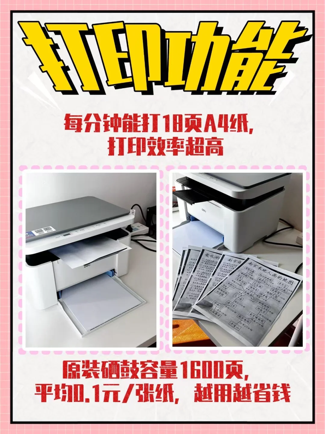 ♥️像我做设计最在意细节和成本,这台打印机的表现完全超出预期。每分钟能打18页A4,还有1200*600dpi高清分辨率,打印设计稿里的线条、小字,清晰到能看清笔触细节,客户看了都夸“你们团队做事真细致”。打印、复印、扫描三合一功能,平时要扫描手绘稿存档,它有1200DPI高清扫描精度,生成的PDF跟原稿几乎没差别,再也不用花钱去图文店扫描。最重要的是,它的原装硒鼓可以打印1600页,分摊下来一张1毛钱,比打印机店便宜多了,长期主义必冲!