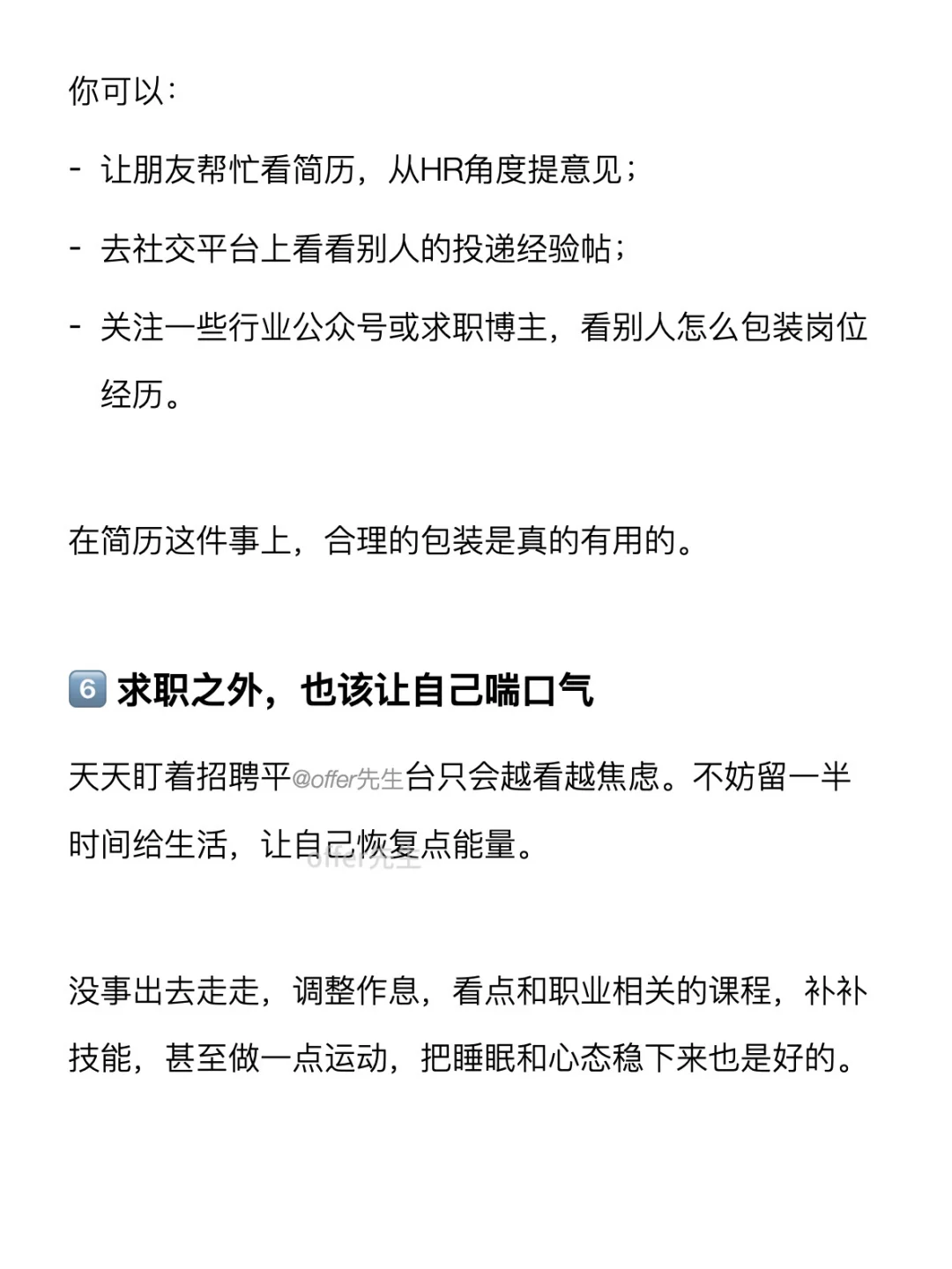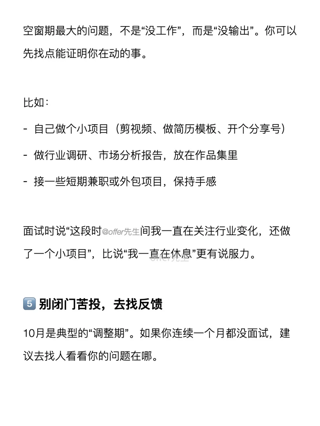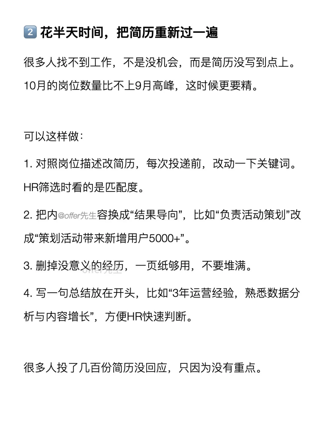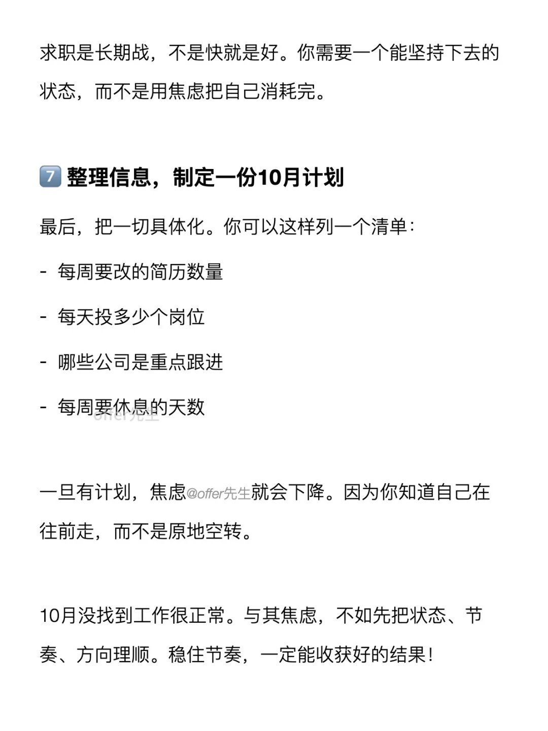 很多人到10月都会开始焦虑——秋招都过了一半多了,岗位越来越少,投了几十上百份简历都没回音。 . 但其实,找工作这件事有周期,也有节奏。如果眼下还没结果,先别慌着乱投乱跳,可以先调整下节奏,把状态稳住、方向理清,反而更容易在后面一个月里找到出路。 . 坚持日更✊🏻,帮大家在找工作路上顺利拿到offer! .