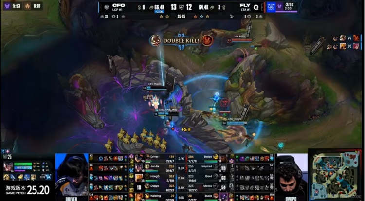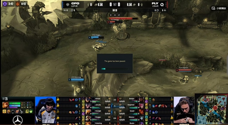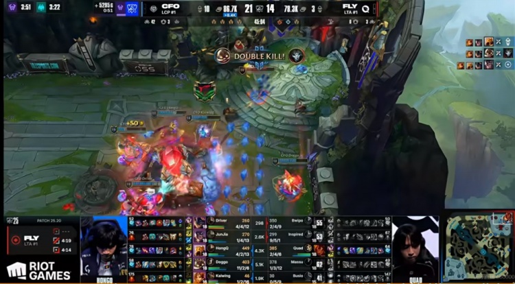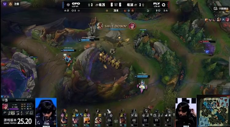 首局比赛前期双方互有失误,FLY先行拿下听牌龙+3K经济优势,但是CFO随后拿下厄塔汗!关键河道团Quad岩雀飞脸被Kaiwing曙光逮捕,CFO一波1换4之后拿下大龙反超经济!随后CFO先破高地但是下野又被FLY反杀守住!野区团FLY强杀HongQ沙皇打出2换3强开大龙,但是大龙拿了被复活的Driver兰博+Doggo库奇打出0换3!无人存活!