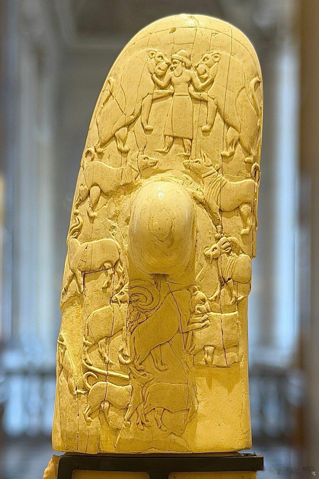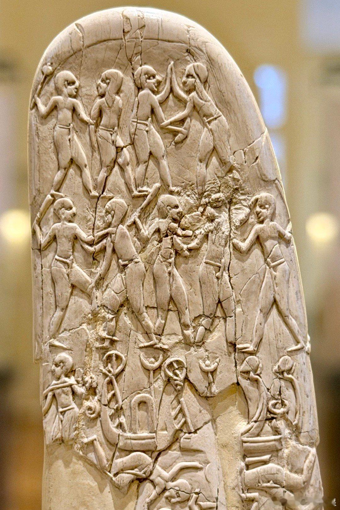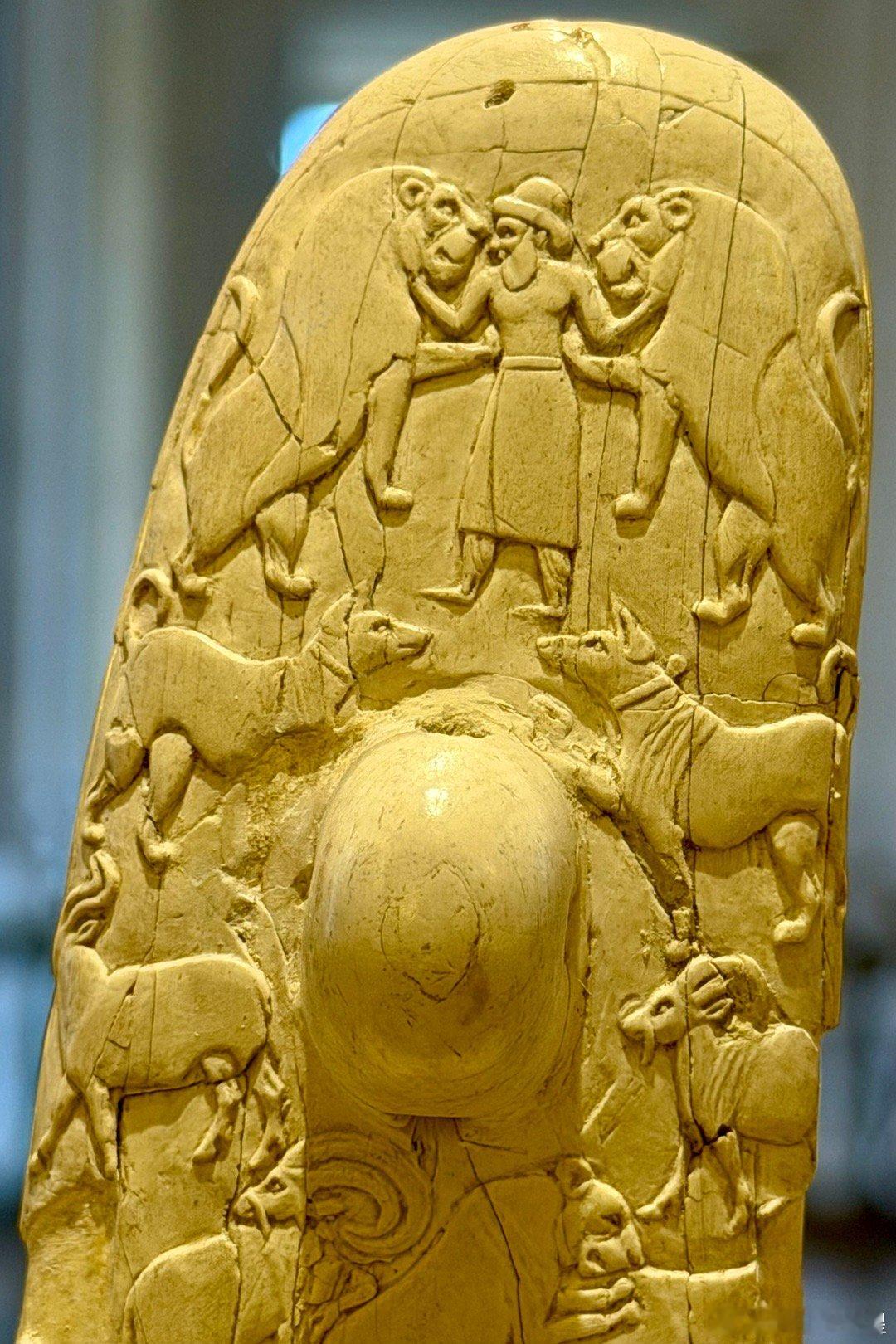 象牙刀柄的另一面雕刻着美索不达米亚风格的动物形象。最上面有一位身着美索不达米亚服饰的人物在掐住两只猛狮的脖子。有专家认为这个人是古迦南宗教里的众神之父埃尔。也可能是太阳神乌图的儿子,苏美尔乌鲁克第一王朝的国王美什千加舍尔。这把石刀从图像上证明了上古时期的埃及和美索不达米亚文明有过深远的联系,两河的文明传入埃及,对埃及文明的早期起源有巨大的影响。所以这把刀也是整个欧洲最重要的古埃及文物之一。