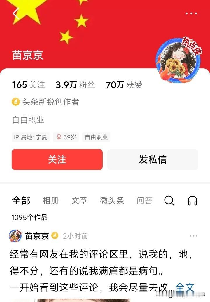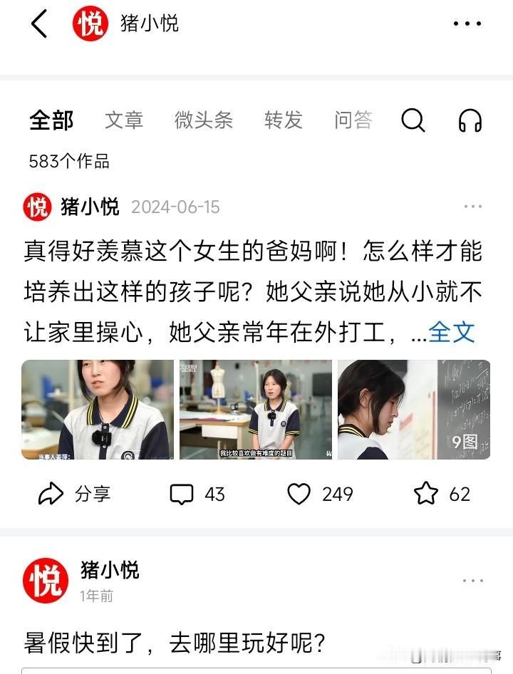 说实话,你觉得苗京京还会火多久呢? 正所谓,古语有云,盛极必衰!有些人有些事在到达顶点的时候,就必然会走向下坡路。 不知道大家是否还记得,以前也曾出现过很多个现象级的热门大咖,比如“猪小悦”、“淡泊姐”、还有“铅笔哥”等…… 她们都曾引起过众多人的追捧,就拿“猪小悦”来说,凭借她对热点事件的独门见解的描写,她在短短时间里就俘获很多人的喜爱。 98W,这是猪小悦最后定格的粉丝数量,虽然有这么多人喜欢,但猪小悦已经断更一年多了。 猪小悦在她巅峰时期,那可谓人气爆棚,就和现在苗京京一样,很多人都在写她,说她。 猪小悦也曾说过这些人对自己造成了困扰,逐渐的她也慢慢不怎么写文了,她去做过卖课,也去做过直播,甚至还想要做旅游探店博主什么的。 但最后还是沦落到停更,至于猪小悦为什么会停更,众说纷纭,没人能知道其中原因。 不过在我看来,有时候热度太高,未必是件好事,“闷声发财”这话并非是白说的,太过招摇是会给自己带来麻烦的。 大家觉得苗京京接下来会继续这么厉害吗?欢迎留言评论。
