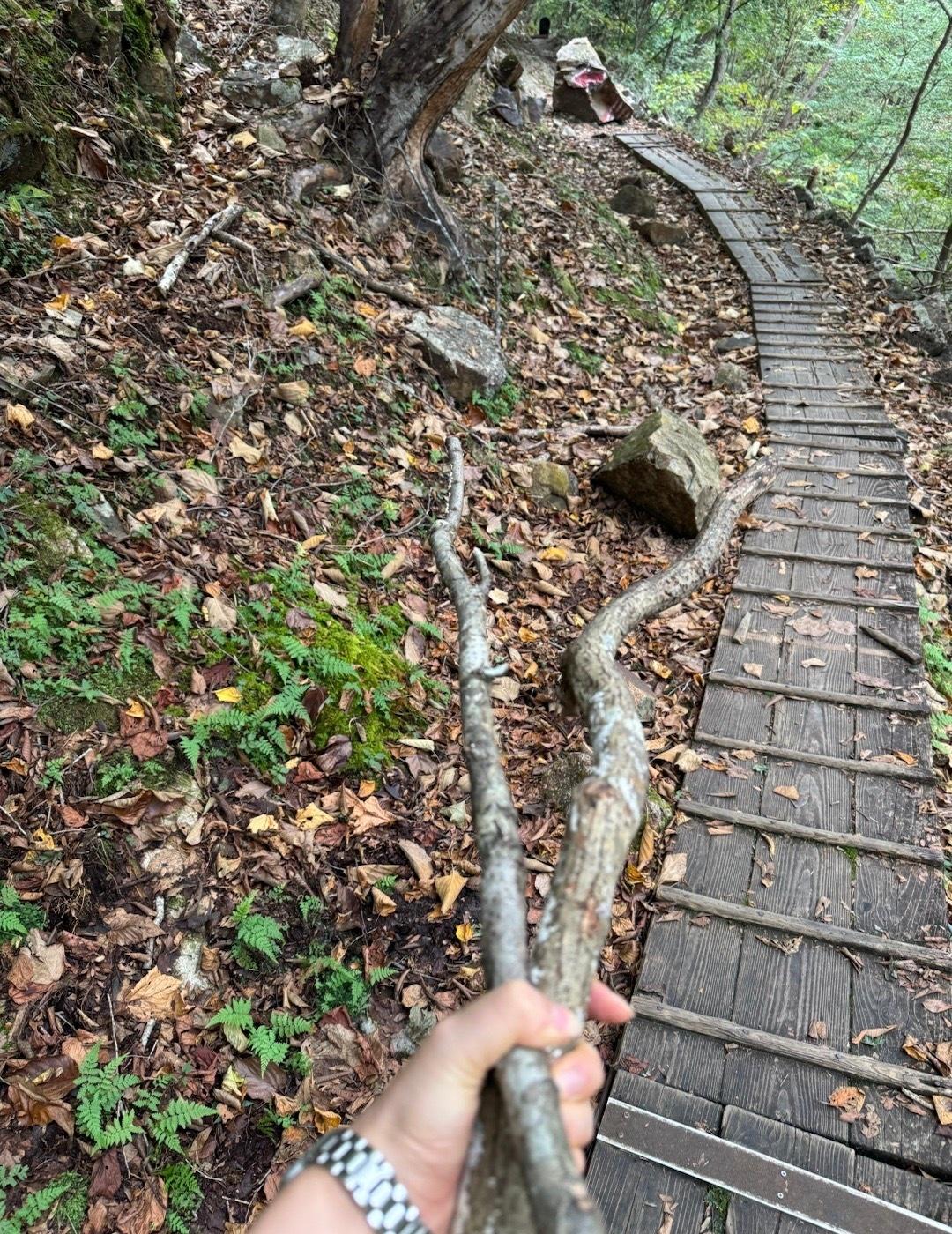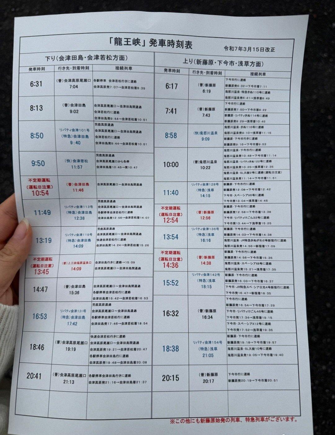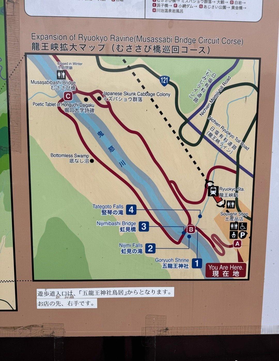 【日光-龙王峡徒步新新新手攻略】 适合我们这种根本没有徒步过一不小心人生第一次徒步的人阅读。 1.交通 从日光去龙王峡交通不算特别方便,如果你有maas(4500yen套餐),可用的最后一站是到新藤原(下今市换乘一次)。新藤原到龙王峡因为已经不是东武线范围,现金购票200yen单程。龙王峡站时刻表图8,一定要看好,否则回程不便。 2.路线 如图6,有四种路线,新手(指基本没有徒步过的情况)就不要考虑3和4了。路线1就800米很轻松,时间也短。我直接略过,路线2不走回头路,往返1小时(实际情况后文说)。 路线3到白岩,注意是单程2小时!到白岩如果你体力不支可以巴士回,最好预留时间。龙王峡站那边没看到返程时刻表,可以提前Google一下。 3. 路线2实际情况 大家一定要注意天气,我是10.23去的,那几天日光整体大雾警告,中禅寺雾浓到像寂静岭,我到龙王峡的时候是阴天。这种情况大家要格外小心,这可能意味着实际上山里湿漉漉的,就算没下雨,地上也有泥泞感,会滑! 路线2一开始是常规路线,都有扶手栏杆人也多,然后从虹见桥过桥到对岸,沿峡谷环线到むささび橋过桥回去,由此不走回头路。非常非常需要注意的就是,虹见桥过对岸之后的步道是自然步道,不知道这个词是什么意思的朋友们有福了! It means野路,山里的野路,有地方有栏杆很多地方屁都没有,还有很多路上高低落差都是下坡,却只有乱石,和,没错!记得前面说了阴天雾气多湿漉漉吗,你会在覆盖落叶的乱石上疯狂脚滑。如果你没有徒步经验,穿的是普通运动鞋,这种天气走那段路就会非常恐怖。 首先没人,几乎没人走这边。我越走越明白为什么,但是回头路也很惊险,不断体会到进退两难,只能硬着头皮往前走。 其次如果你是普通旅客只是想随便走走山里的台阶却不慎选择此路线,你多半没有登山杖。所以路上如果有机会,看到合适的树枝一定要拿在手里!!!你在无数的上下坡石头路泥路都会需要。因为很多路段旁边没有护栏,要是滑倒了就是无阻碍速降峡谷一路把你送走。 我在走路过程中前期还分神看风景,差点滑了一跤就老实了,吓得屁滚尿流握紧手杖树枝,一直自言自语:我还年轻,不能死这!每一步都走好!活着出去!我还有猫! 朋友们,人生所需的全神贯注,就在此刻。山里有落差,看似就七百米,可能会走很久。一定小心! ps最好不要像我似的这么虎直接自己去,山里徒步最好还是结伴,不确定情况的“自然步道”不要去。我的登山爱好者朋友说,冬天山里黑得很快,四点就要是已出山状态最安全。人迹罕至的路就别去。不确定就赶紧返回。可以提前下载好离线地图防止山里没信号。 (龙王峡我用SoftBank的卡信号还是挺好的,奥日光就真的是除了路边都依稀仿佛只有一咪咪) 然后就是注意熊!最好自己戴个熊铃挂包上。今年日本🐻出没新闻挺多的。看图9可以学习一下,如果遇到了!不要把后背露给熊,要慢慢后退撤离,急速逃跑可能刺激熊来追你。 绝对不要靠近小熊!很多情况就是家长熊出于护幼本能攻击人。 我去之前发现没什么人提这个山里的情况,第一个新手经验帖就由我来守护! 总之祝大家早去早回,平安出山。
