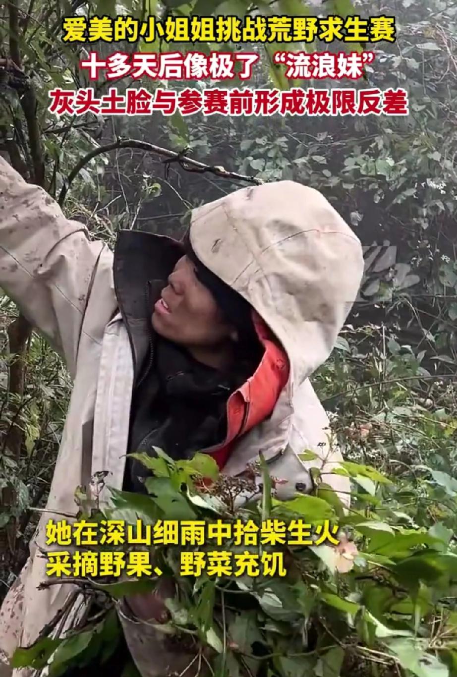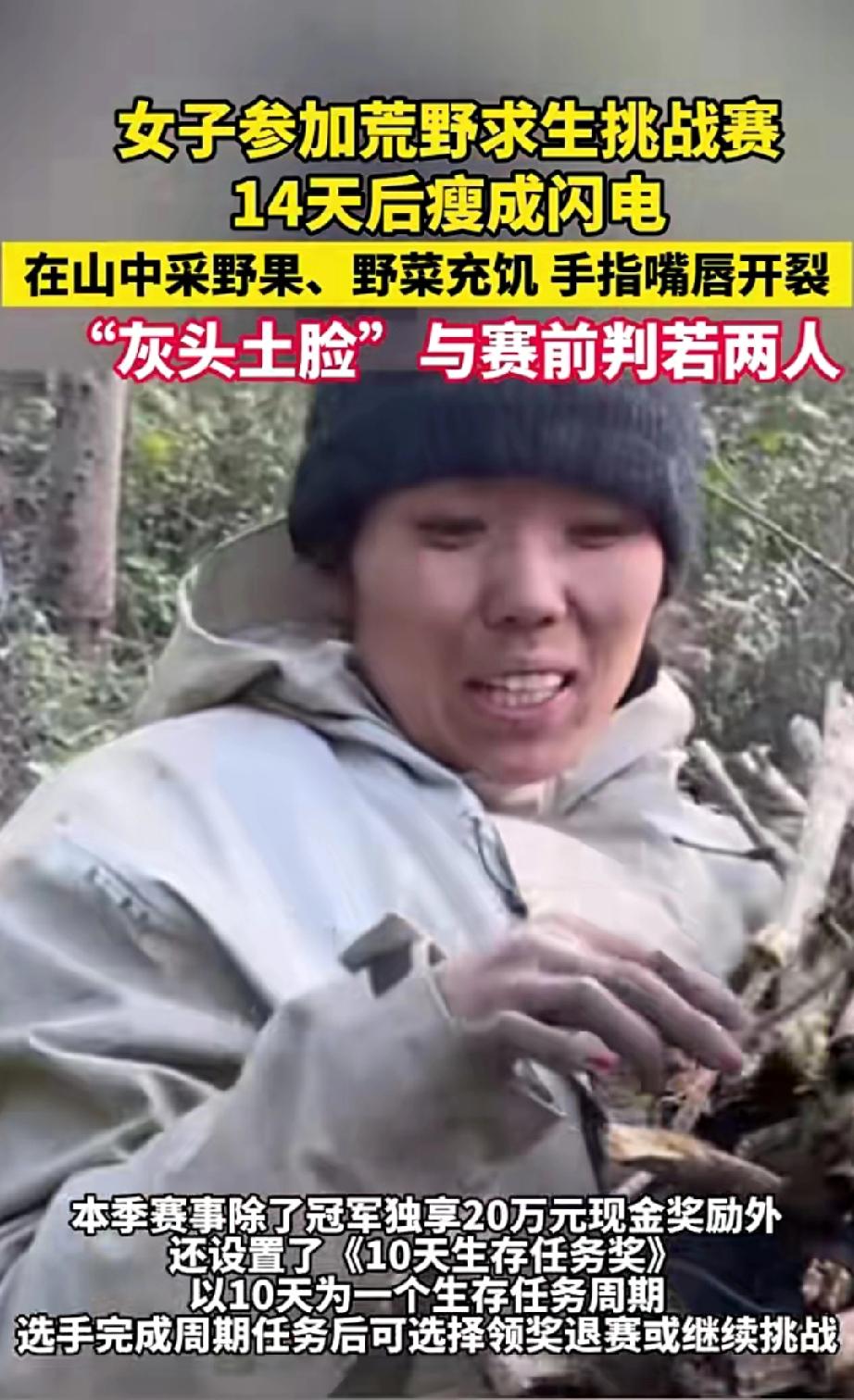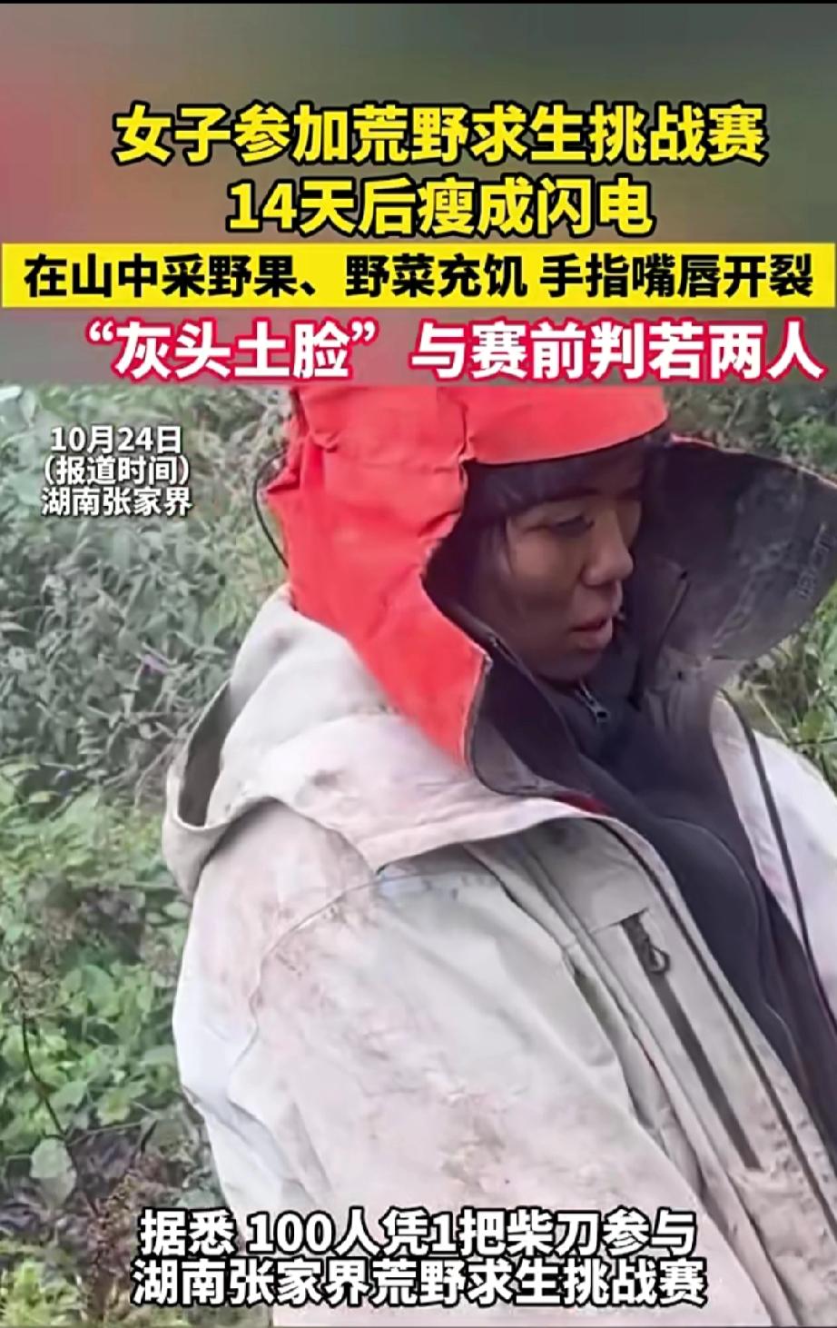 一位女选手参加湖南张家界荒野求生挑战赛,14天暴瘦脱相引发热议。 这姐们儿进山前还是个精神大美妞儿,出来时整个人跟被抽了条似的,嘴唇裂得跟干旱的田地一样,手指头糙得能当砂纸使。 她在深山里头靠捡柴火、摘野果子过活,赶上那阵子天公不作美,整天阴雨绵绵,饿得前胸贴后背。 最新消息说组委会正在核查是否违反安全规定,网友吵吵着“这哪是减肥营分明是变形记”。 专业人士分析这种极速掉秤可能伤元气,就跟手机电池过度放电会折寿一个理儿。现在大伙儿都蹲后续呢,指不定能扒出更多猛料。