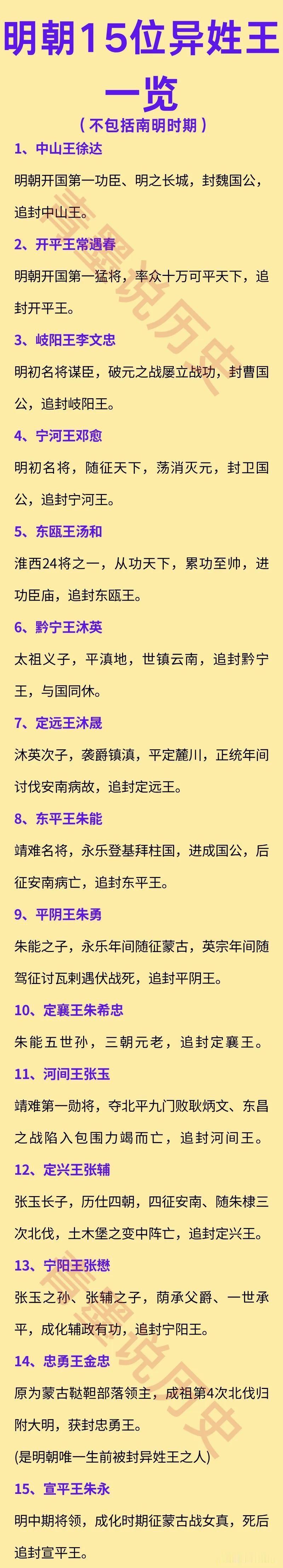 明朝15位异姓王,结局都这么好,到底是为啥? 我们知道,一般一个朝代的亲王,都是皇帝家的同姓亲戚,就像明朝的王都是朱姓,清朝的王都是爱新觉罗姓。 而明朝一共有15位异姓王。 虽然被封为了异姓王,但却只是荣誉称号,因为这15位王,都是在死后追封的,并没有实际封地,也没有给兵权。 既然没有封地,也没有篡权的可能,更因为这些虚名对皇权没有任何威胁,所以这些异姓王的结局大多较好。 有人说这些异姓王中,有的也姓朱,我怎么样才能分出哪些是本姓王,哪些是异姓王呢? 其实很简单,明朝的本姓亲王封号多为单字,例如秦王、晋王,而异姓王的封号均为双子,例如中山王、东平王。