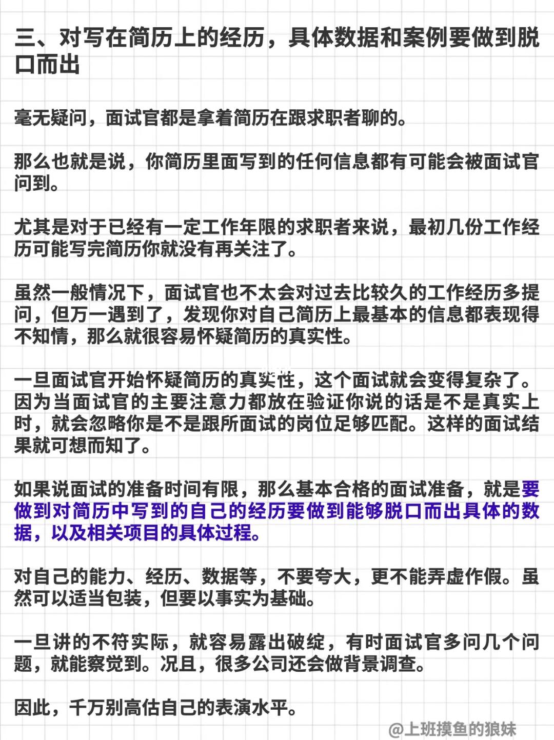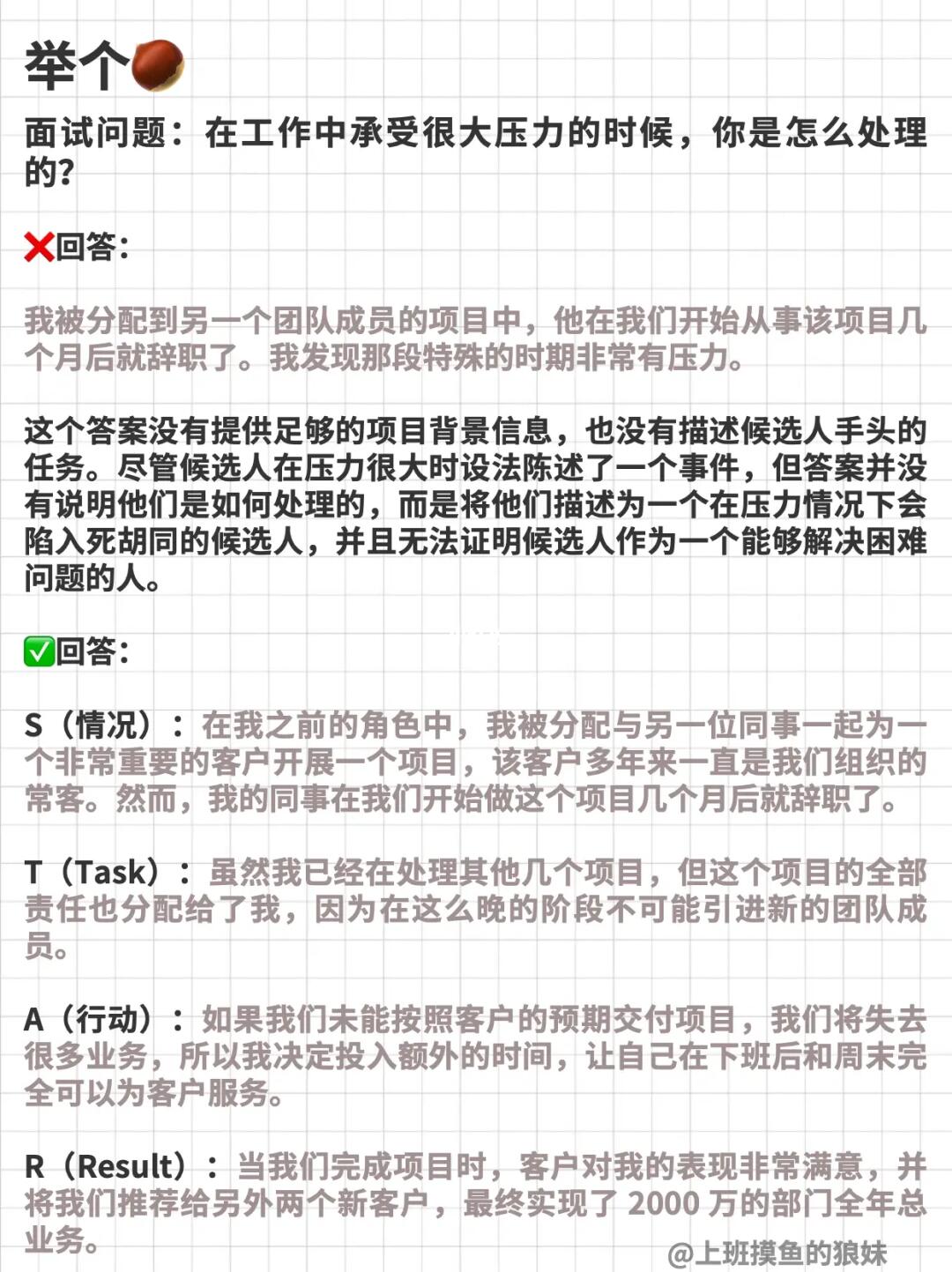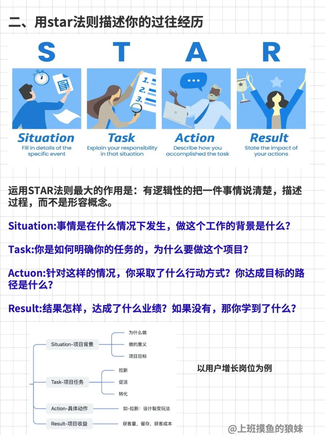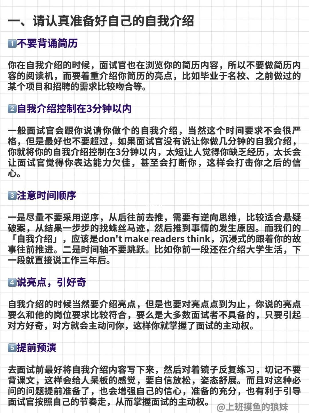 说来惭愧,如果你比较笼统地问我一个关于“面试答题技巧与思路”的问题,我一时半会儿还不太好答。 因为找我辅导的姐妹每个人面对的面试问题不一样,工作经历不相同。但是,有一些比较通用的面试技巧是人人可用的⬇️ 💛如何在面试中进行自我介绍 1⃣️不要重复简历内容 2⃣️时间控制在3分钟之内 3⃣️注意时间顺序 4⃣️说亮点,引好奇心 5⃣️提前预演 💙用star法则描述项目经历(附案例) ❤️要对面试中的项目经历和数据非常熟悉