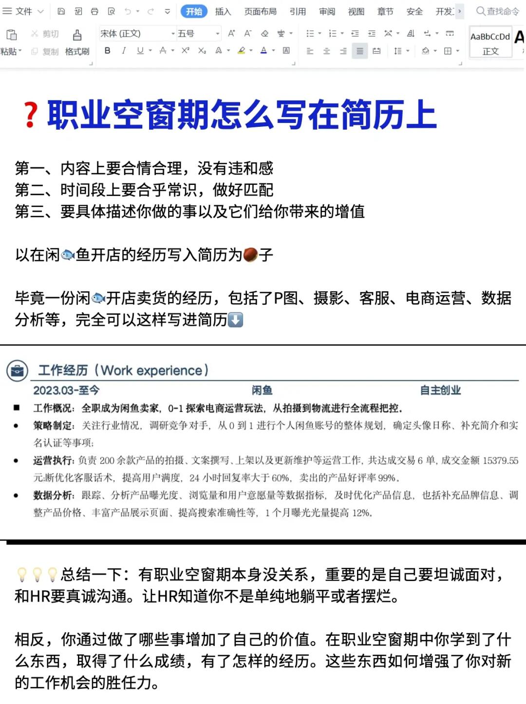 其实有的人利用空窗期做副业,比如摆地摊、在闲鱼上开店、做志愿者,只要你把这段经历巧妙地融入简历,并积极准备面试技巧,应对HR们针对空窗期的问询,相信空窗期不是你的劣势