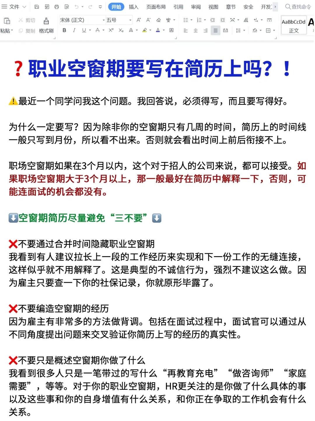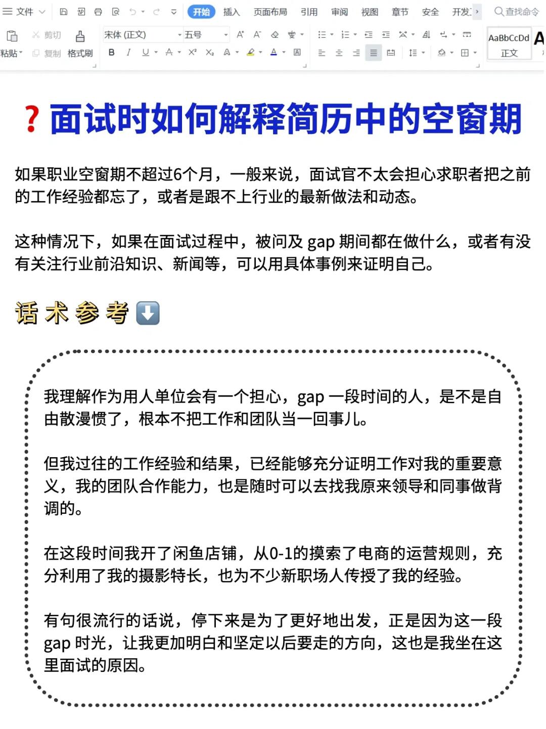 [飞吻R]最后,在面试环节,如果面试官对这段空窗期还有顾虑,除强调简历中呈现的内容以外,还可以结合岗位需求,告诉面试官自己在这段空窗期中是如何思考自己的职业规划,并为了弥补这段空窗期给自己职业生涯造成的影响,会如何在后面的工作中加倍努力与成长,追回那段被耽误的时间。