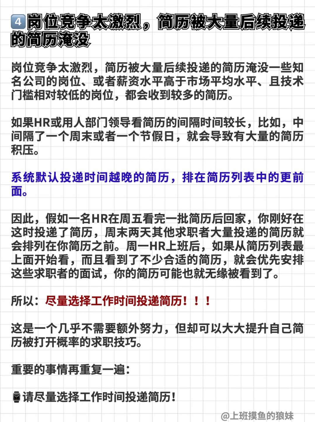 🙅因此,假如一名HR在周五看完一批简历后回家,你刚好在这时投递了简历,周末两天其他求职者大量投递的简历就会排列在你简历之前。