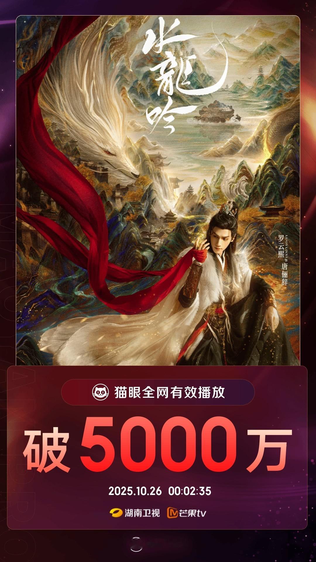 电视剧水龙吟官方[超话]水龙吟连续2天登顶剧集热度榜水龙吟有效播放量破5000万 据猫眼专业版,(按演员姓氏首字母排名)领衔主演的网络剧《水龙吟》开播第3天,连续2天登顶剧集热度榜,有效播放量破5000万! ​​​