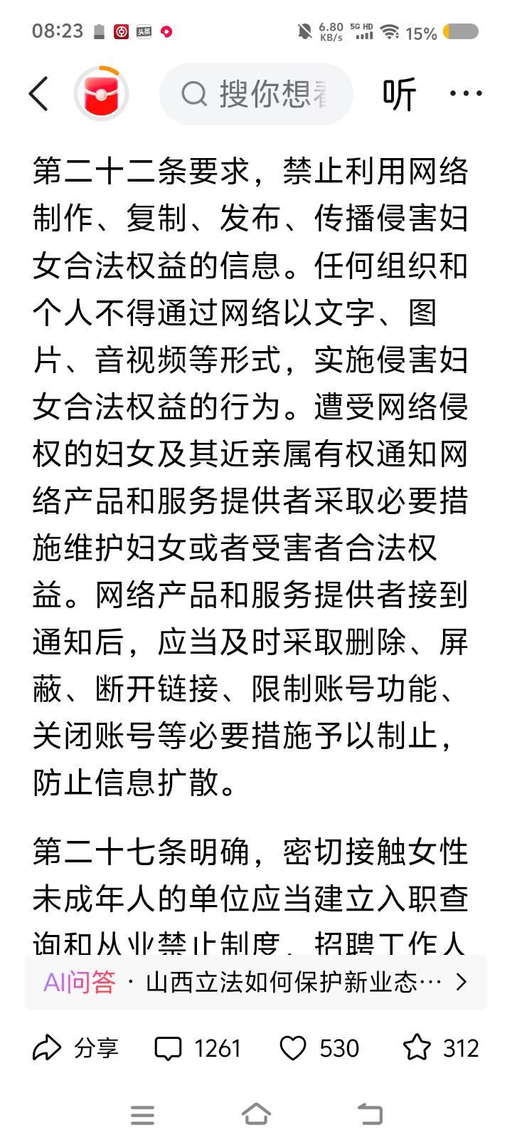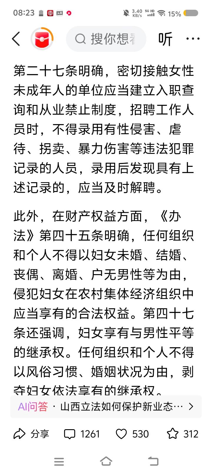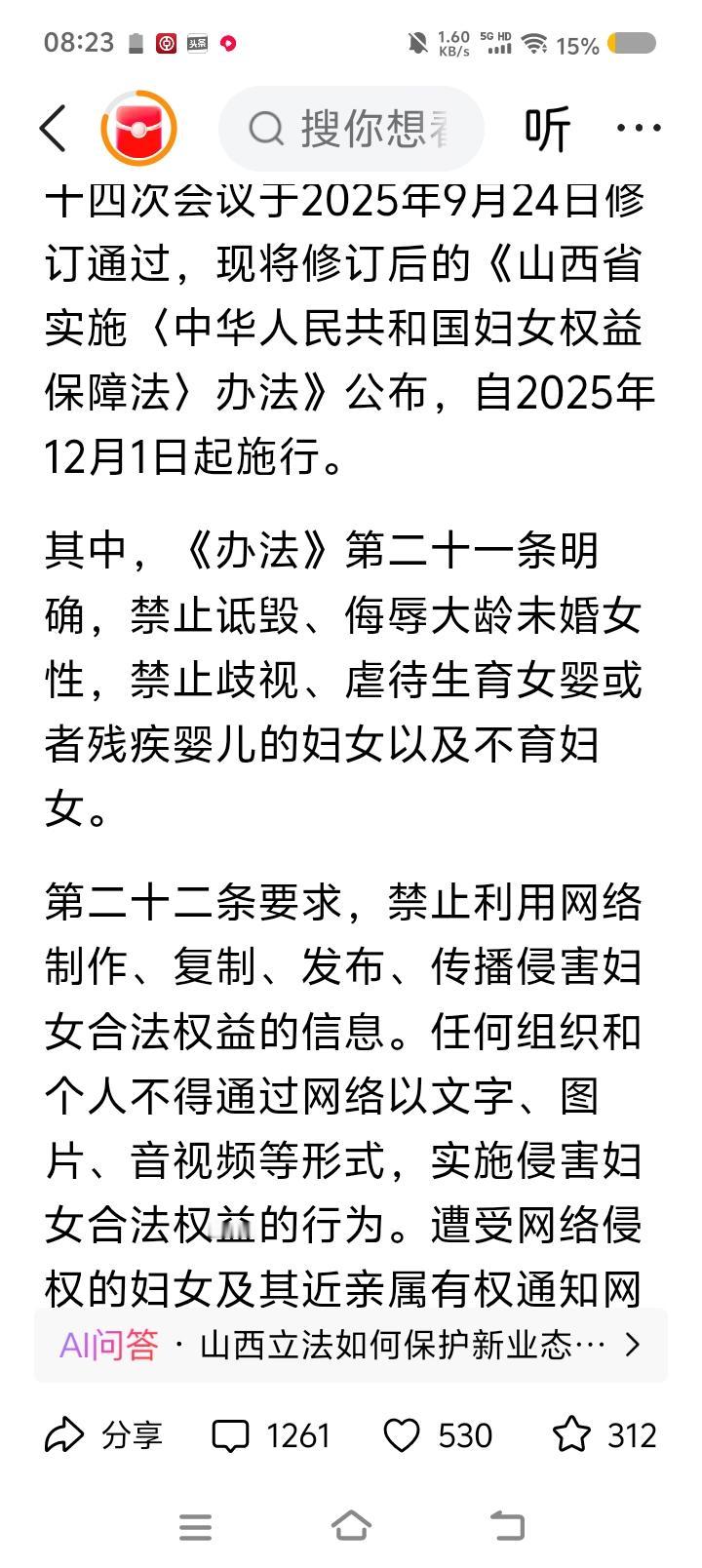 山西一部法规,炸出多少法盲!—— 近日,山西出台一部保护妇女权益的法律法规,是为了实施《妇女权益保障法》。不料,引来网上各种议论。有的甚至质疑其正当性。 岂有此理! 山西就坚决实行男女平等、禁止歧视女性,怎么了?不服来辩!不懂法自个儿学去,违法了有人追究你,别在网上拿无知当力量。 再说了,山西出台的是地方法规,外省的你看不惯也白搭。山西愿意做文明、法治、和谐之地,你奈我何?